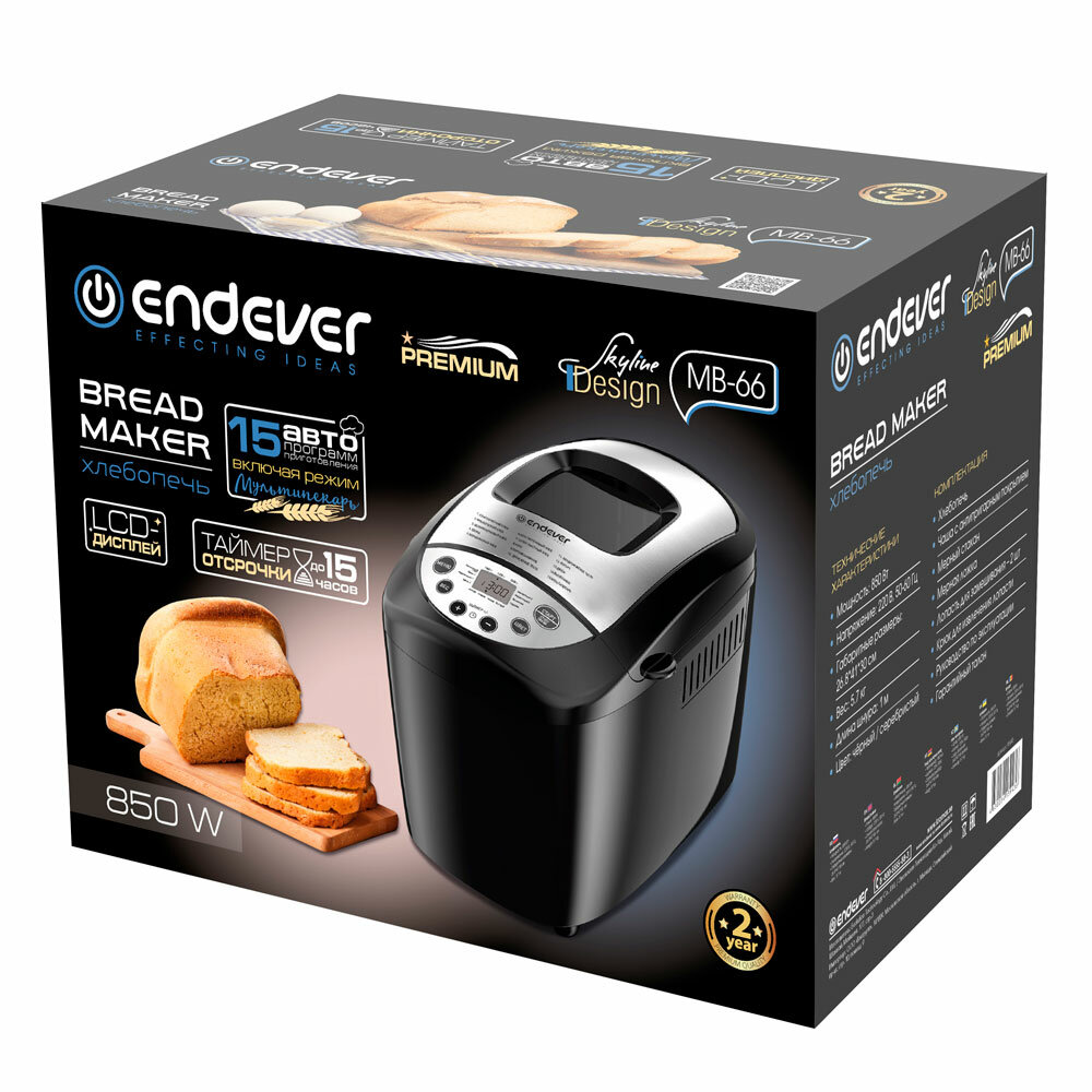 Хлебопечка с замесом теста Endever MB-66 / 15 автоматических программ + мультипекарь / выпечка 1000/1250/1500 грамм