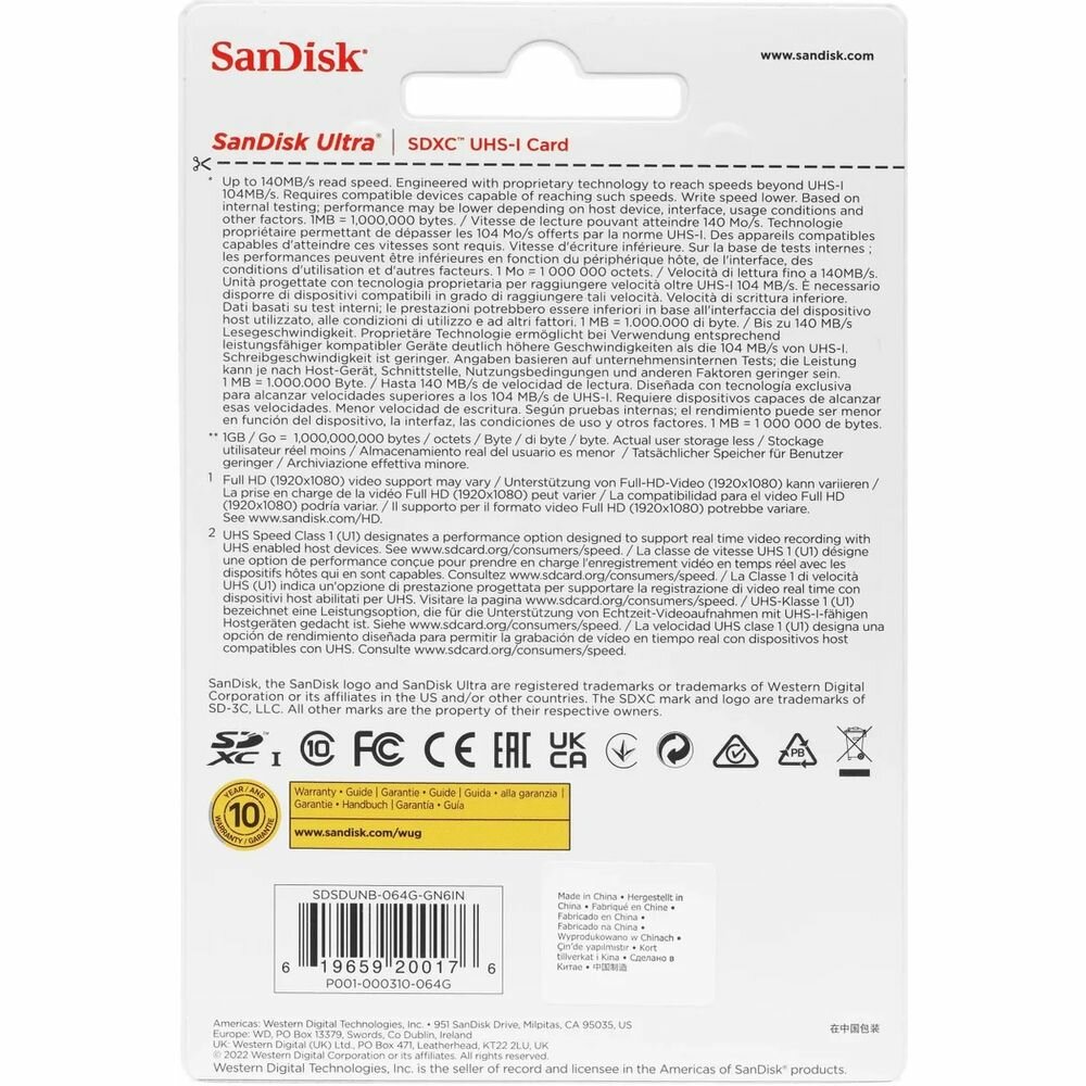 Карта памяти SDXC UHS-I Sandisk Ultra 64 ГБ, 140 МБ/с, Class 10, SDSDUNB-064G-GN6IN