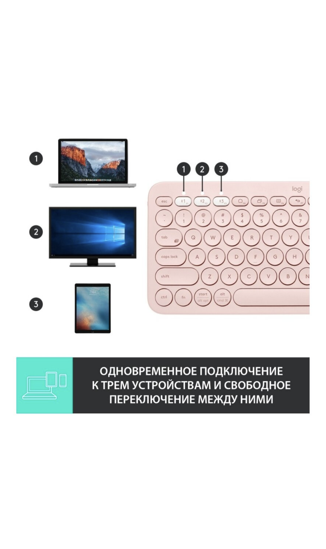 3 устройства можно подключить, и по одной клавише переключаться между ними. Без замены батареек держится больше года (при не особо интенсивном использовании). Для функционала - цена отличная |