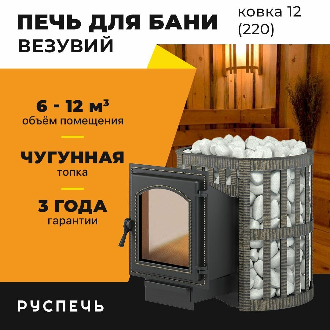 Купить Печь для бани Везувий Легенда Ковка 12 (220) дровяная чугунная со стеклом, сетка каменка