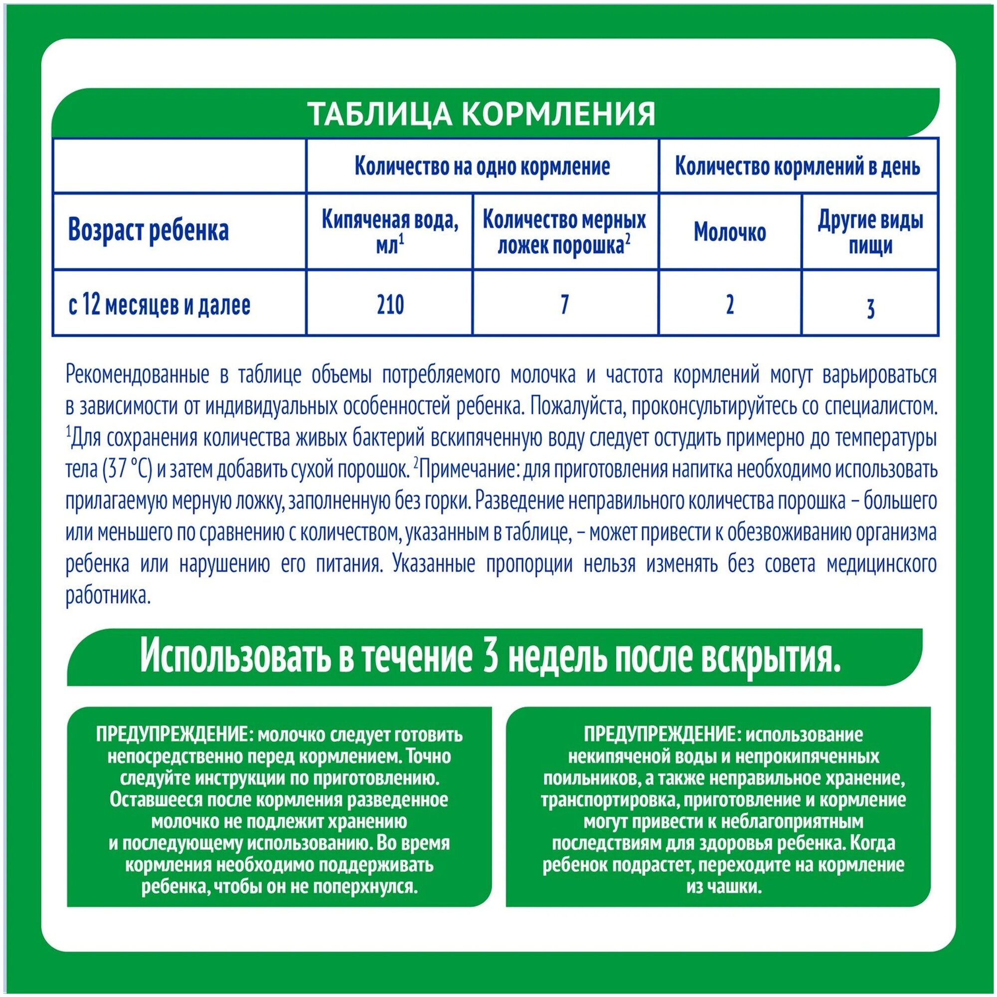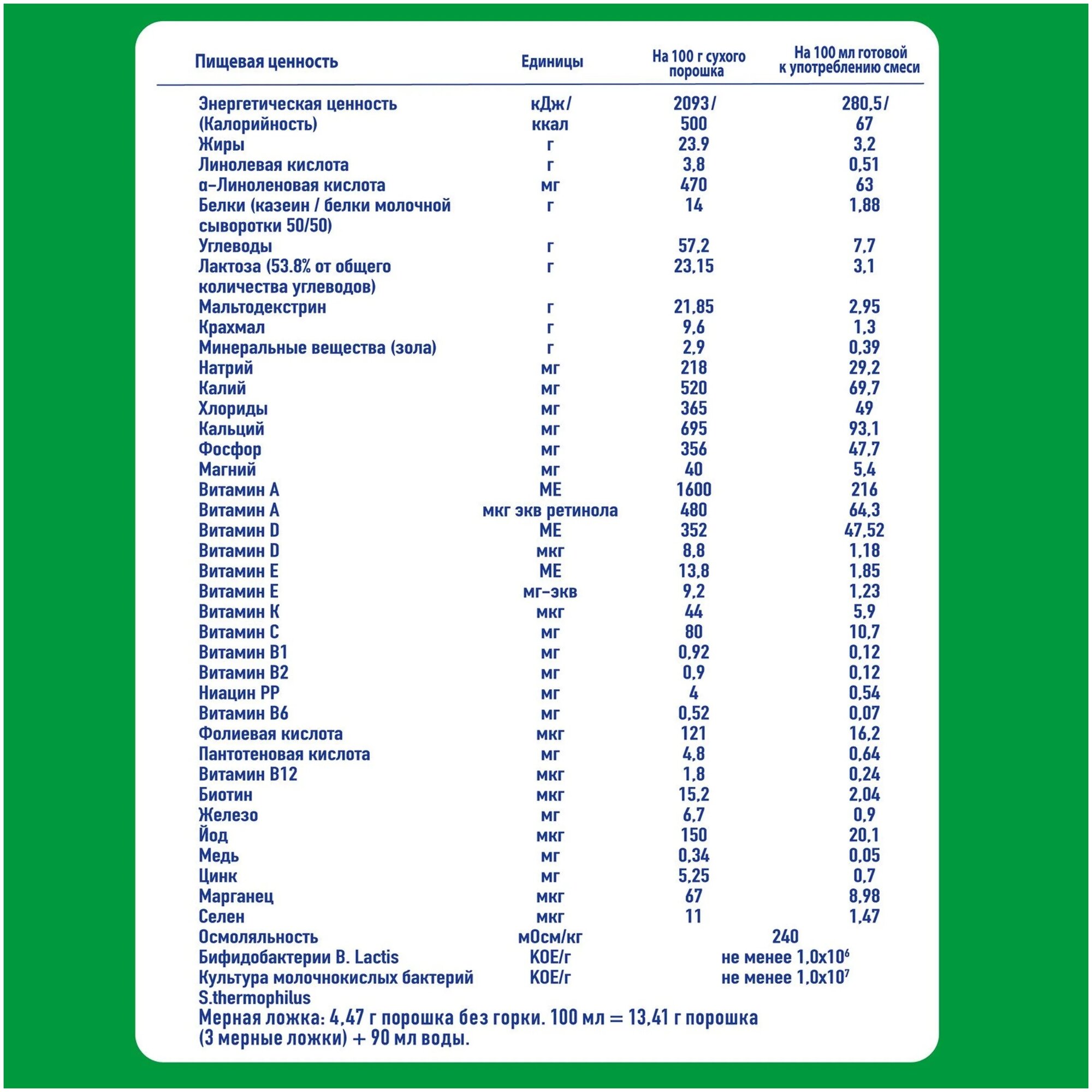 | Состав | обезжиренное молоко, мальтодекстрин, растительные масла (пальмовый олеин, низкоэруковое рапсовое масло, кокосовое масло, подсолнечное… масло), белок молочной сыворотки, картофельный крахмал, кукурузный крахмал, соевый лецитин, цитрат кальция, фосфат кальция, цитрат натрия, витамины, хлорид калия, сульфат железа, карбонат магния, культура бифидо-бактерий (не менее 106 КОЕ/г), сульфат цинка, культура термофильных бактерий (не менее 107 КОЕ/г), сульфат меди, йодид калия, селенат натрия ещёскрыть |