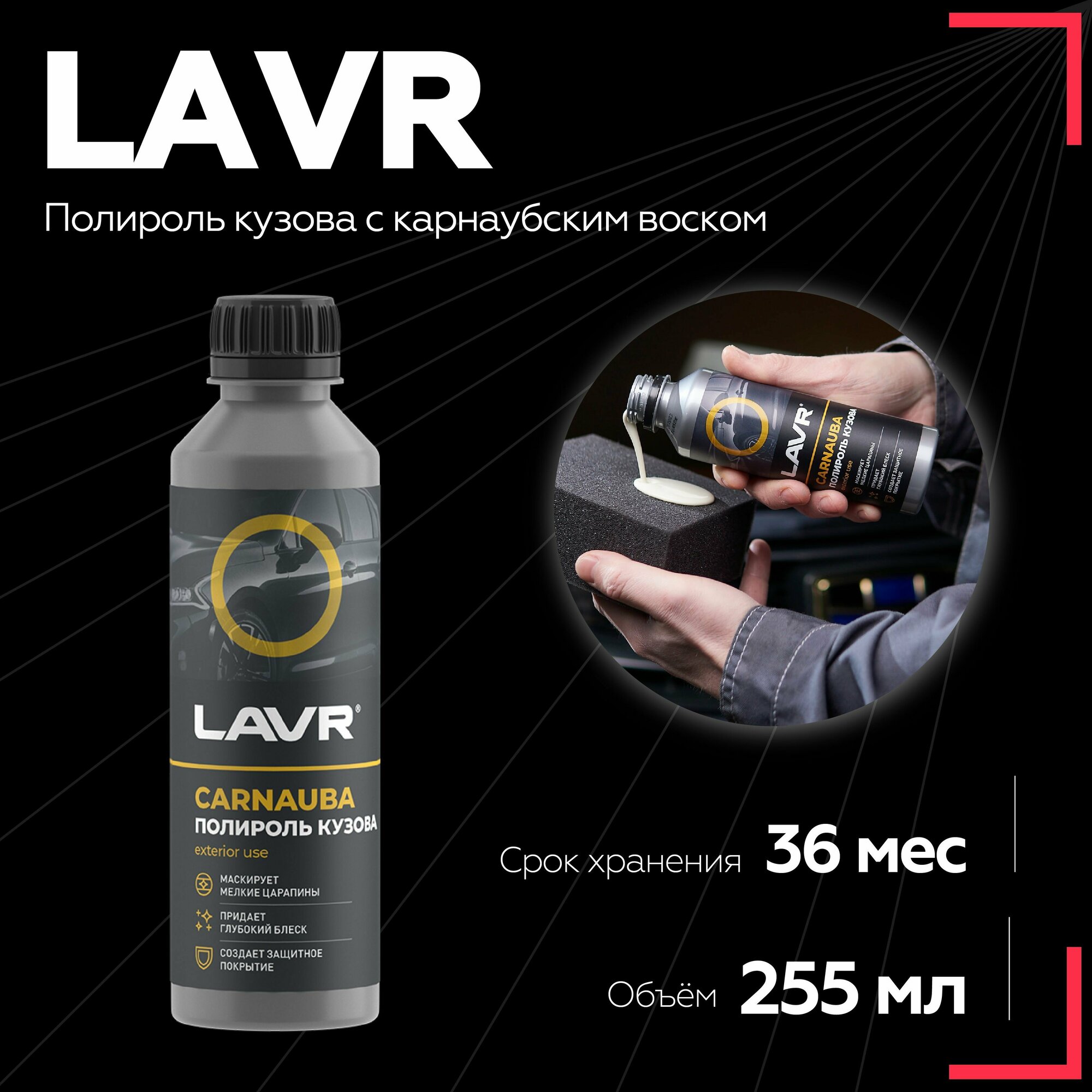 | Способ применения | Не использовать под прямыми солнечными лучами! Применять при температуре не ниже +10°С. Перед применением тщательно встряхнуть. Вымойте и высушите поверхность кузова. Равномерно нанесите полироль на небольшой участок кузова с помощью губки или мягкой ткани. Дождитесь образования белого налета на поверхности кузова. Располируйте мягкими круговыми движениями. |