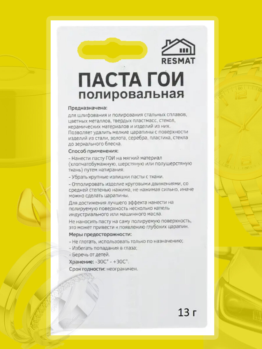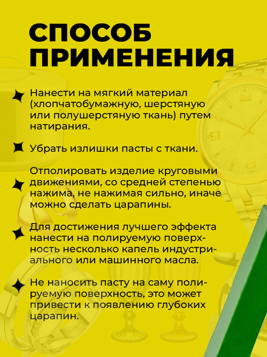 | Способ применения | паста для полировки наносится на мягкую ткань (фланель) или кусок войлока и легкими движениями обрабатывается поверхность в течение нескольких минут |