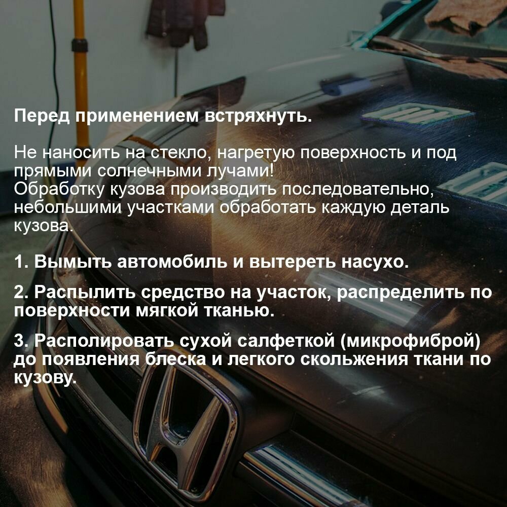| Способ применения | Предназначен для обработки лакокрасочных поверхностей автомобилей и мотоциклов с целью очистки и придания им дополнительных защитных свойств, а также улучшения их внешнего вида. Перед применением встряхнуть. Не наносить на стекло, нагретую поверхность и под прямыми солнечными лучами! Обработку кузова производить последовательно, небольшими участками обработать каждую деталь кузова. Вымыть автомобиль и вытереть насухо. Распылить средство на участок, распределить по поверхности мягкой тканью. Располировать сухой салфеткой (микрофиброй) до появления блеска и легкого скольжения ткани по кузову. Рекомендуется использовать две тканевых салфетки: одну для распределения средства по поверхности, вторую – для располировки. На поверхность вблизи стекол наносить средство с помощью ткани. |