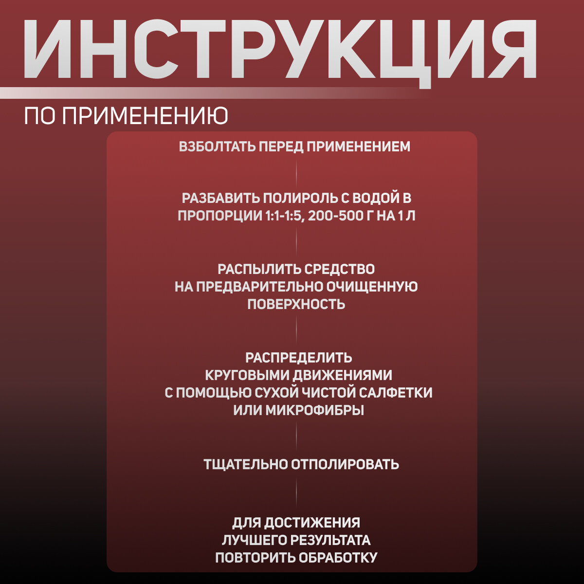 | Способ применения | Взболтать перед применением. Распылить средство на предварительно очищенную поверхность, распределить круговыми движениями с помощью сухой чистой салфетки или микрофибры и тщательно отполировать. Для достижения лучшего результата повторить обработку. |