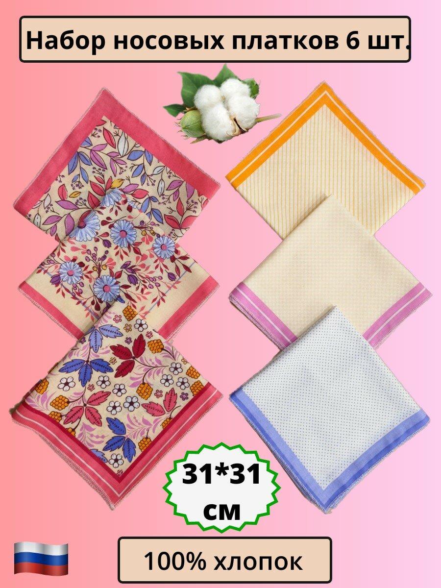 Набор носовых платков 6 шт, хлопок 100%, розовый интересное: