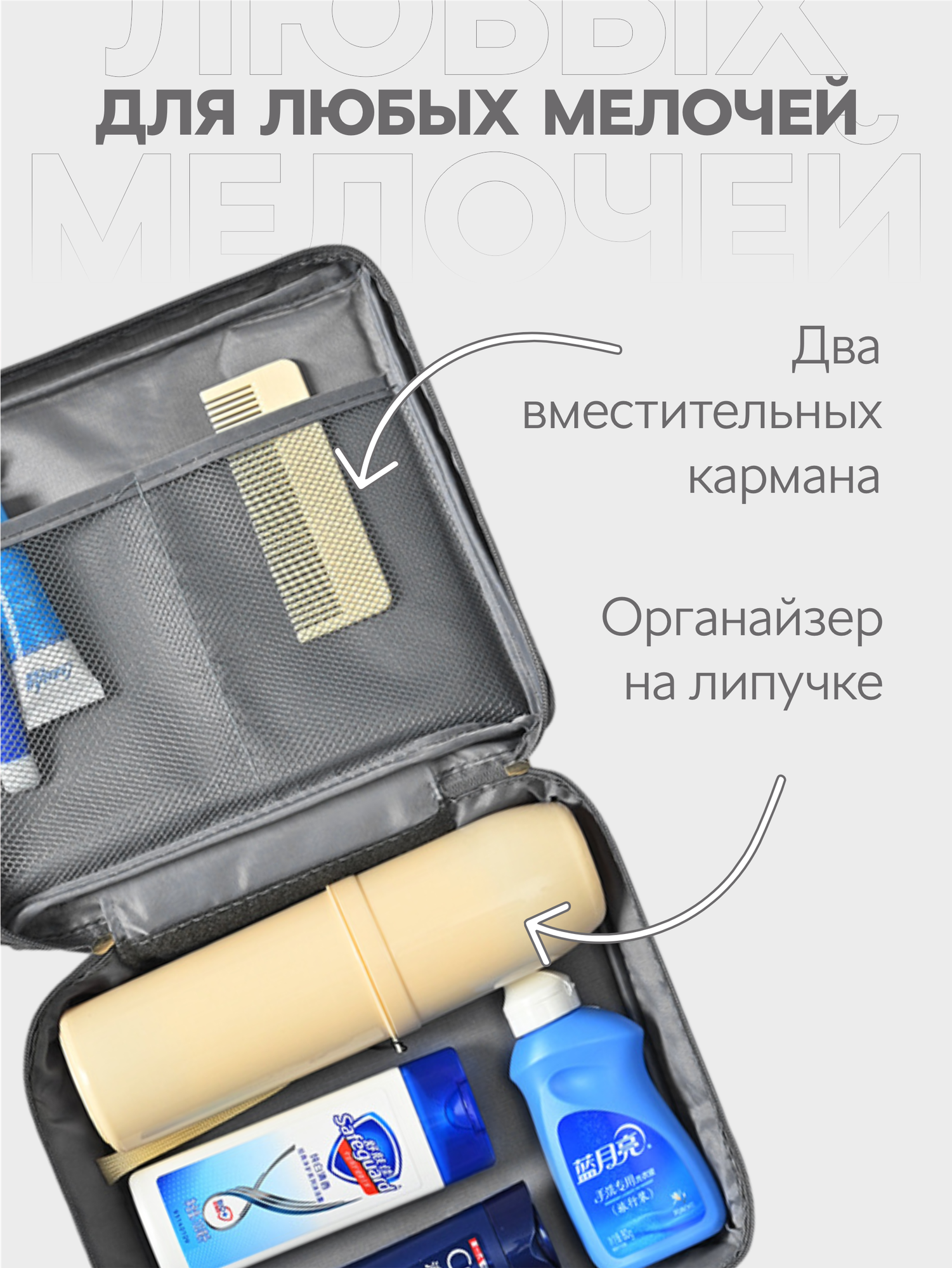 | Дополнительная информация | дорожная косметичка органайзер со съёмным отделом на липучке, непромокаемая, сумочка для путешествий, бьюти кейс, большая косметичка |