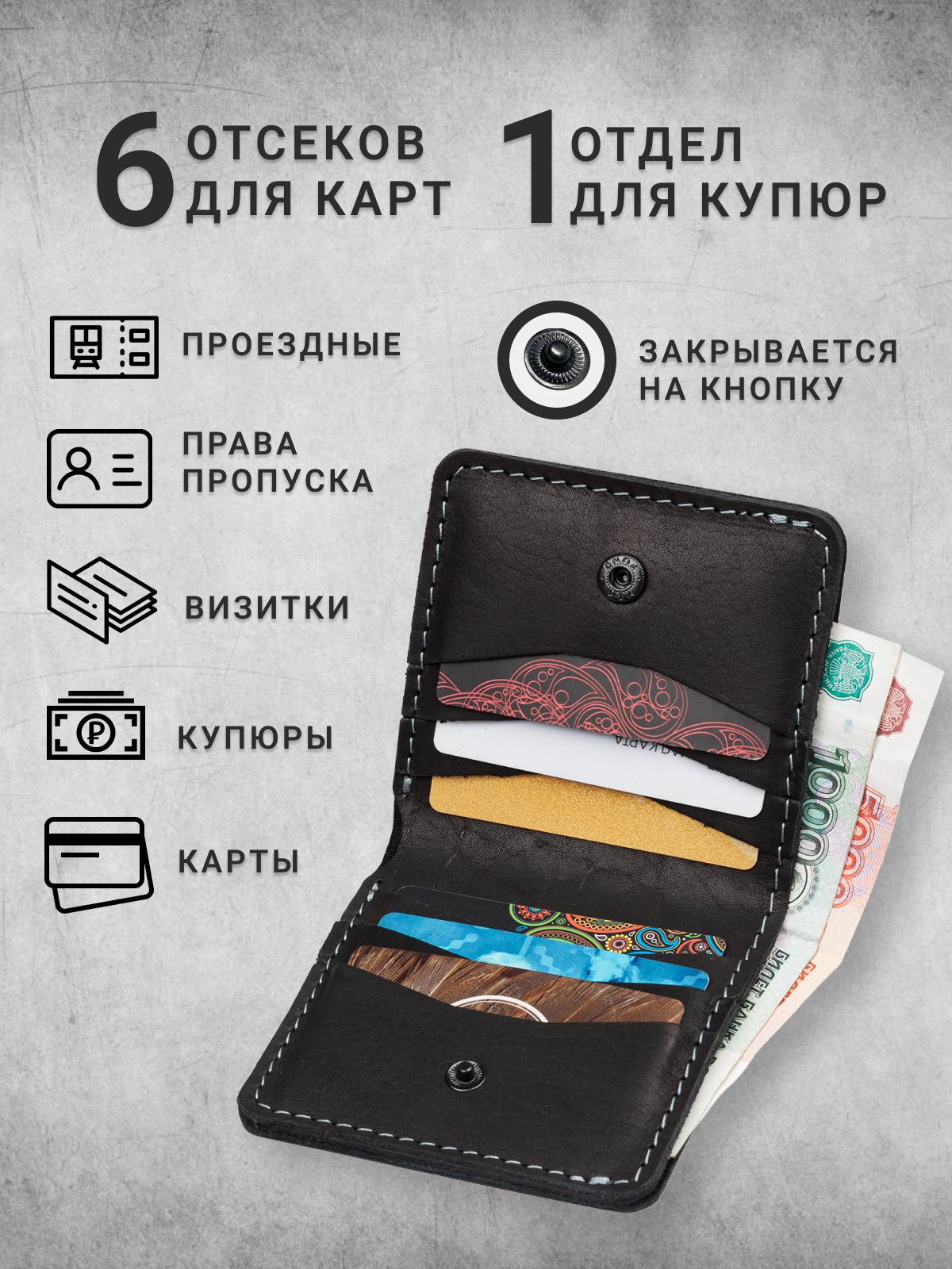 Ниже Вы можете прочитать отзывы на Кожаный кошелек бумажник для карт и денег на кнопке, черный, ознакомится с подробными характеристиками, посмотреть интересные обзоры и фотографии на Кожаный кошелек бумажник для карт и денег на кнопке, черный.