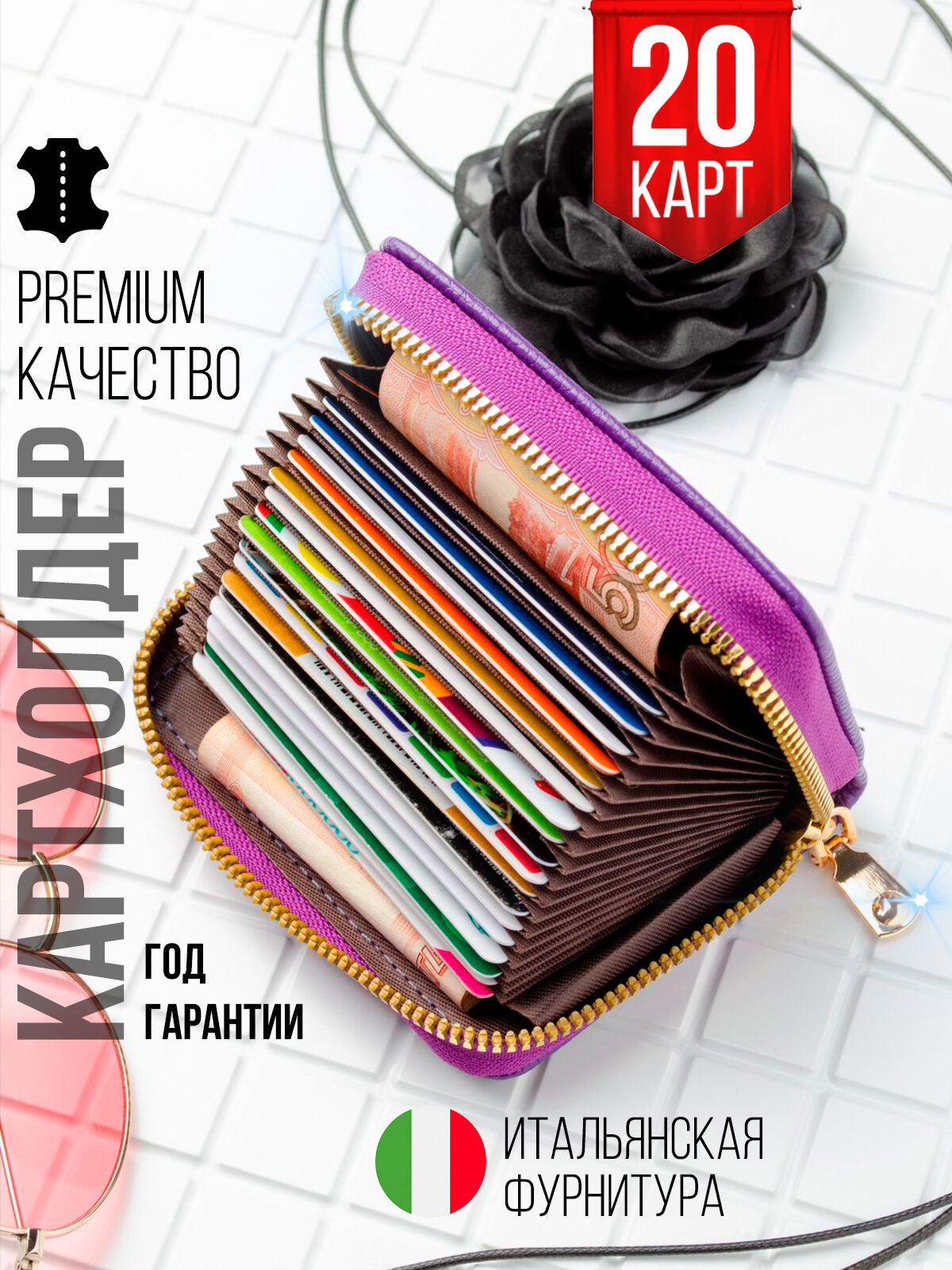 | Дополнительная информация | 20 отсеков для карт; 2 отсека для наличных денег; 1 год гарантии; итальянская фурнитура; экокожа премиум качества; качественно прошитые швы; застежка-молния; RFID защита от краж сканером; для чеков,визиток,пропусков,наличных денег,банковских карт,проездных,водительских прав. |