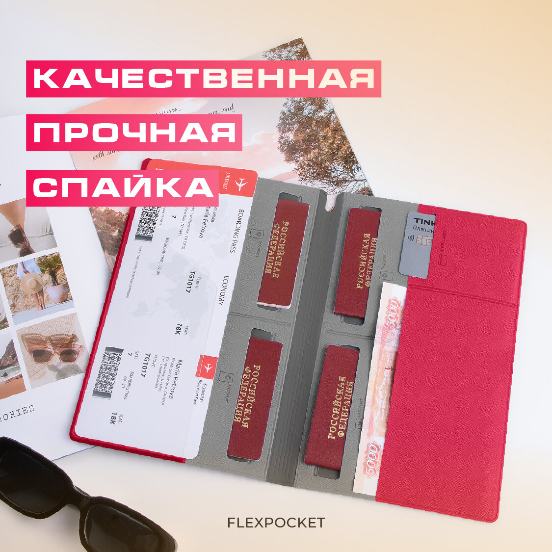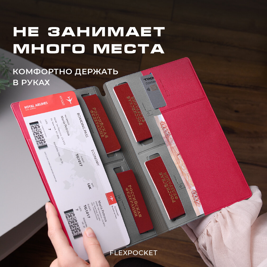 Органайзер для путешествий семейный Flexpocket / Турконверт / Авиахолдер / Папка для документов, загранпаспорта, цвет Красный