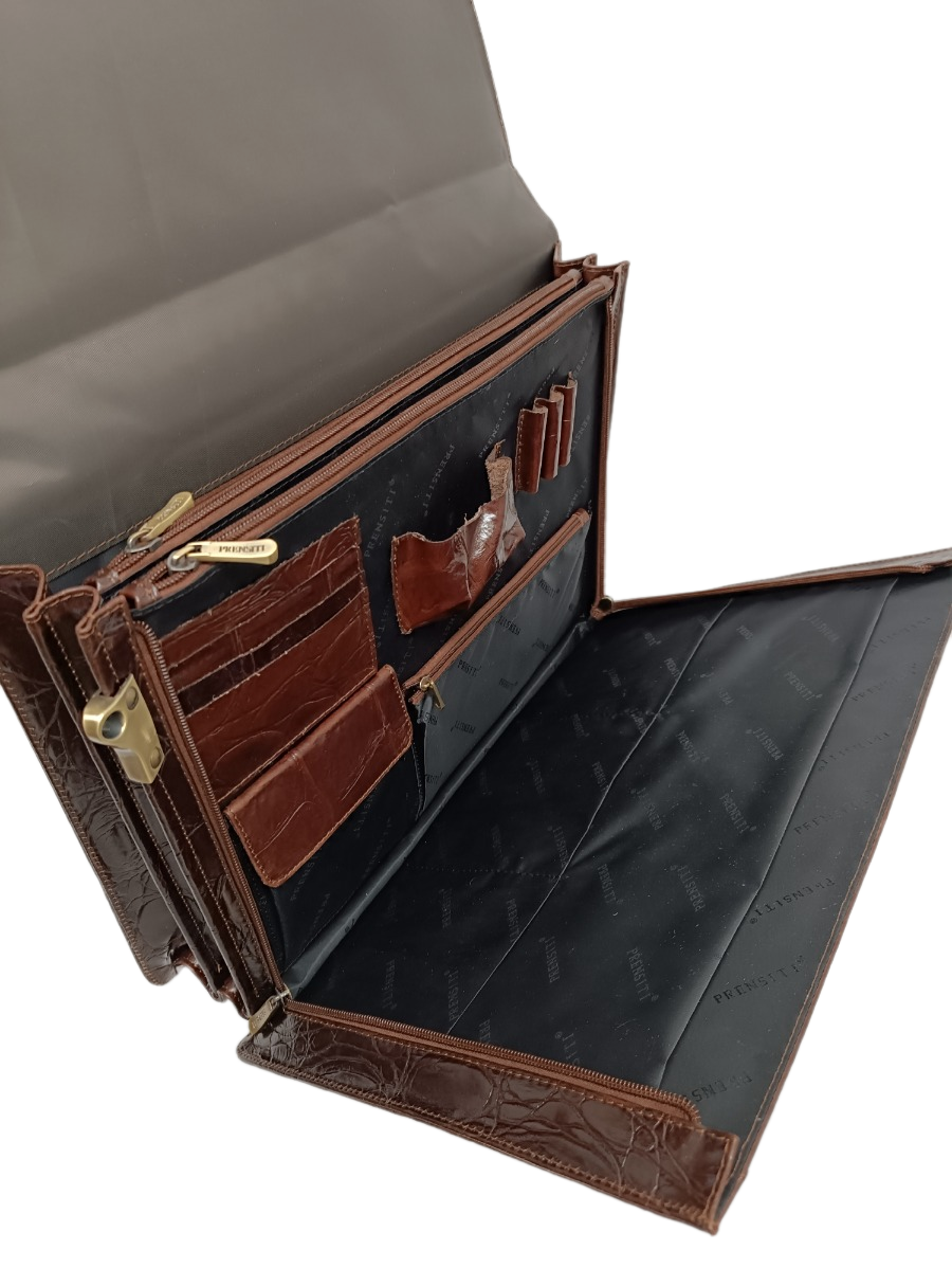 Купить Портфель PRENSITI, натуральная кожа, 3 отделения с перегородками на молниях, карманом на передней стенке, плечевым ремнем, коричневый.