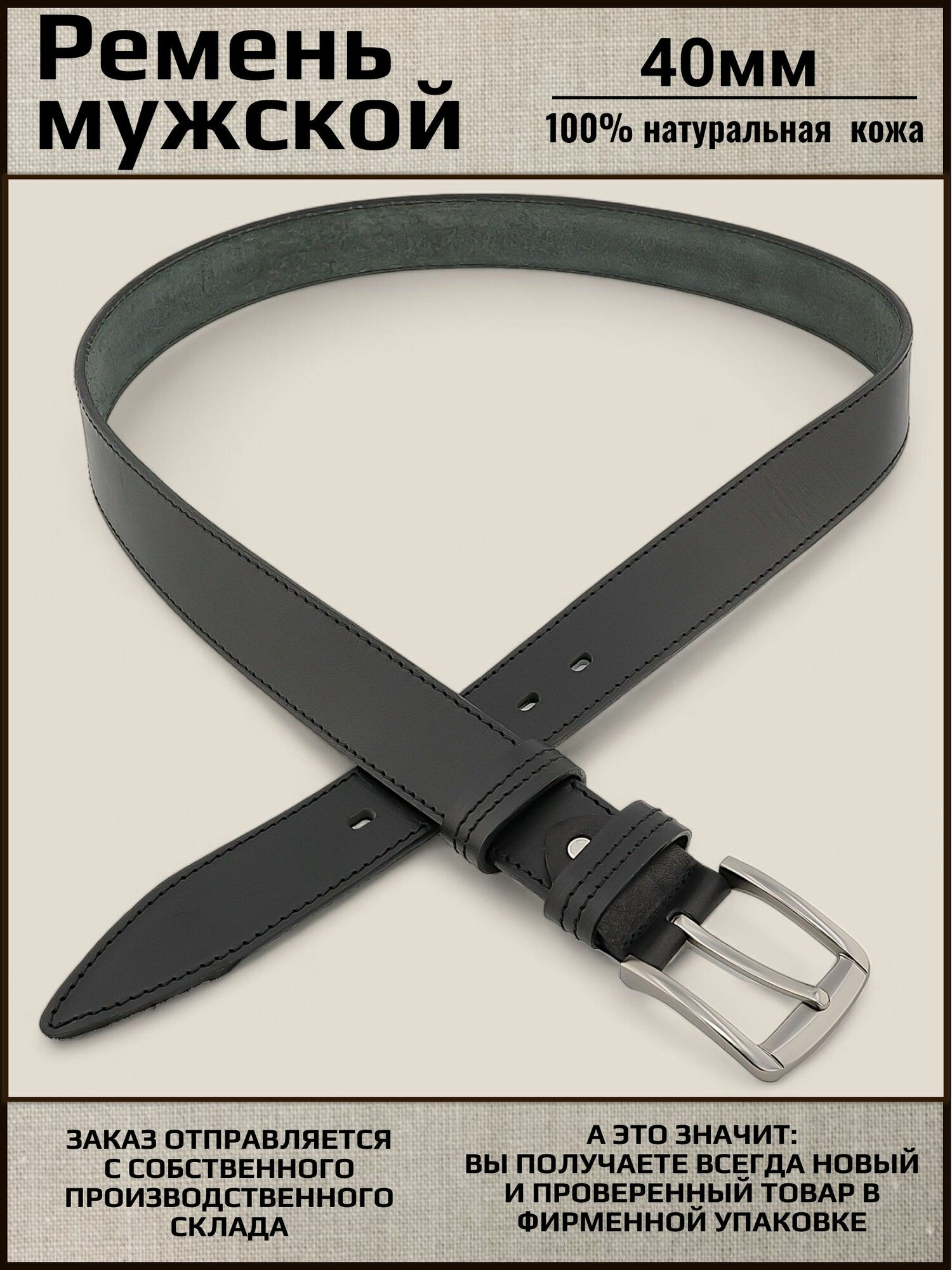 Ремень мужской кожаный AKSY BELT черный, 40мм, 2 строчка, Италия, 110 см