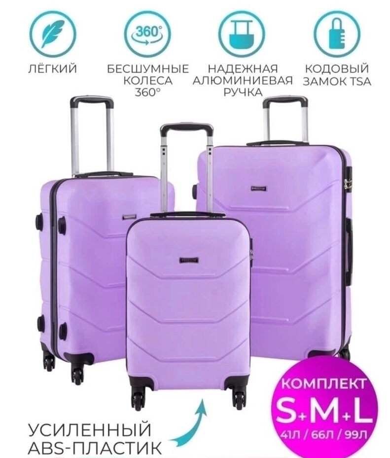 Чемодан М на 4 колесах, ударопрочный, светло - фиолетовый, лаванда интересное: