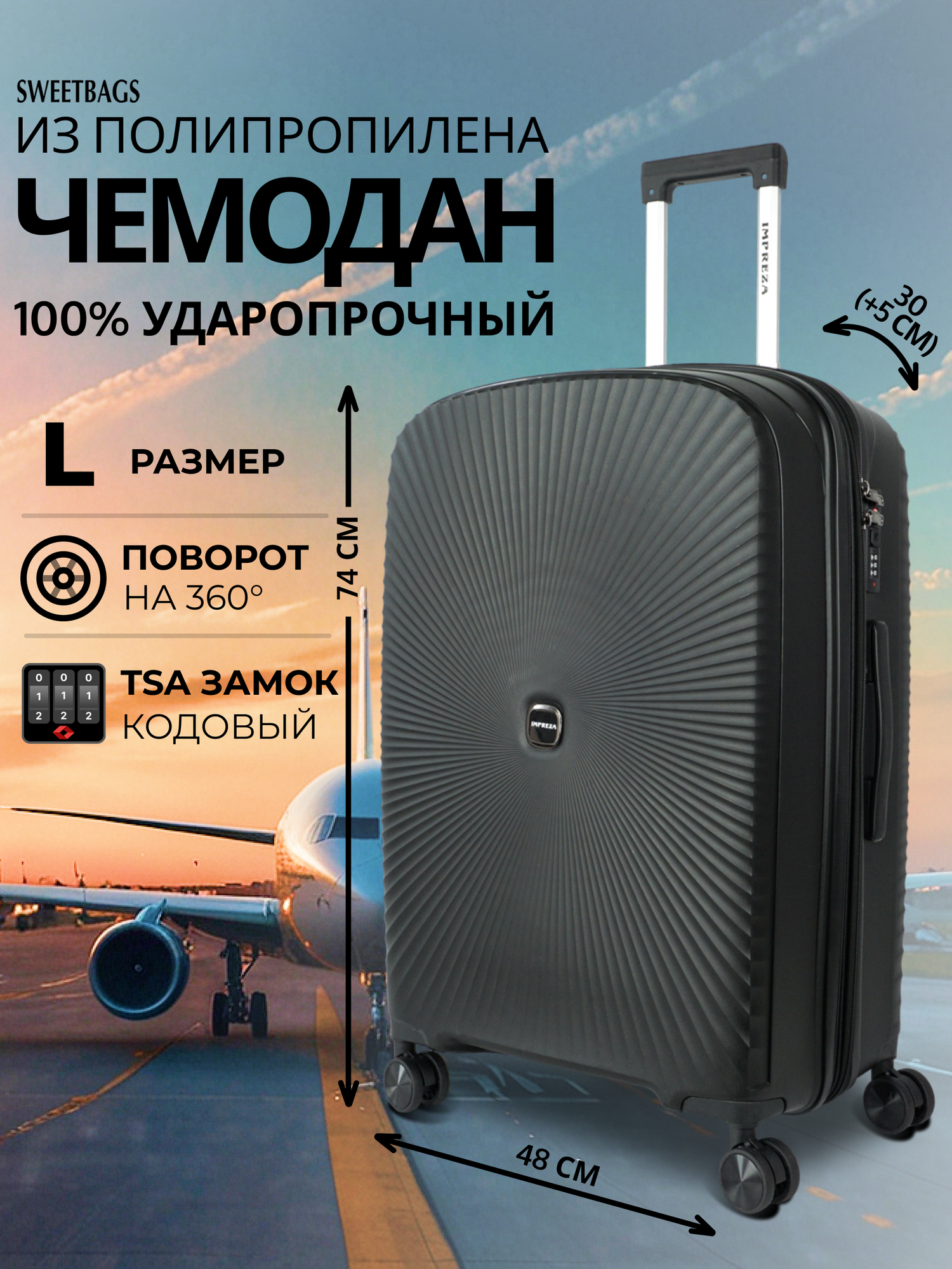 СохранитьЧемодан Sweetbags большой из полипропилена с расширением на 4-х колесах с TSA замком (Insight) черный L интересное: