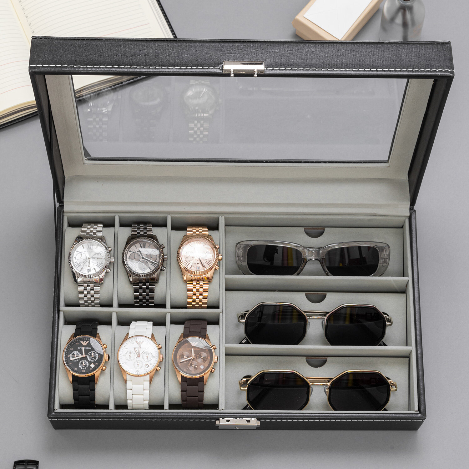 Купить Шкатулка для хранения 6 наручных часов и 3 очков CloxBox W75-B Черная экокожа
