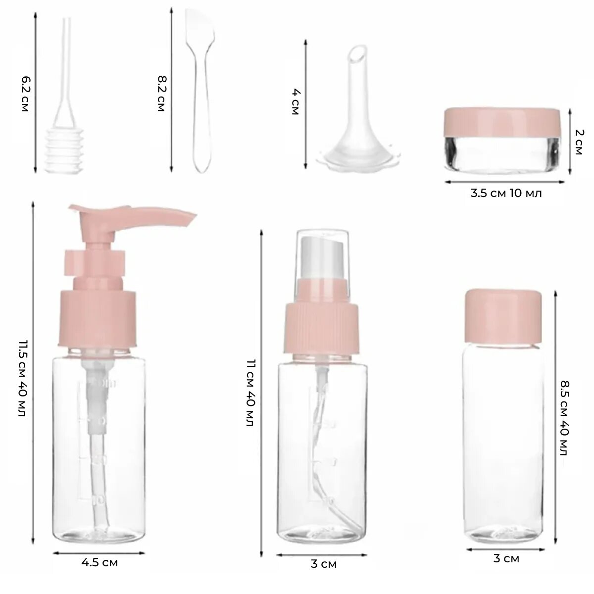 | Подробная комплектация | Он включает в себя 2 тары с закручивающейся крышкой, 2 с пульверизатором для создания спрея и защитным колпачком, 1 с дозатором для гелеобразных составов и блокировкой нажатии, вместительностью 80 мл и 2 маленькие ёмкости объемом 10 миллилитров для сыпучих или тянущихся ингредиентов (тальк, пудра, крем для рук, порошок). |