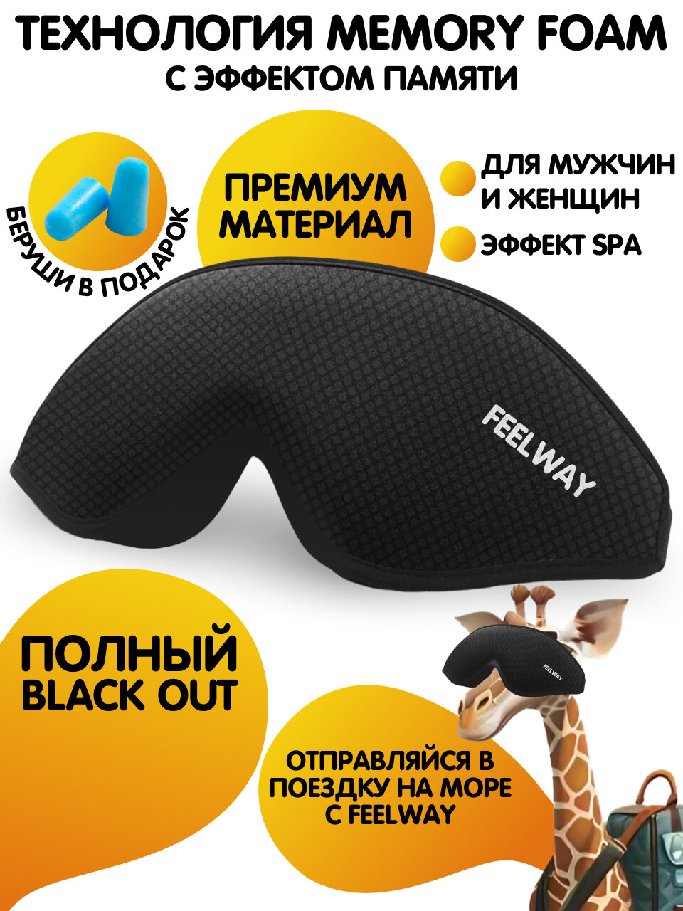 Дорожный набор FEELWAY: маска для сна 2 шт, беруши, черный