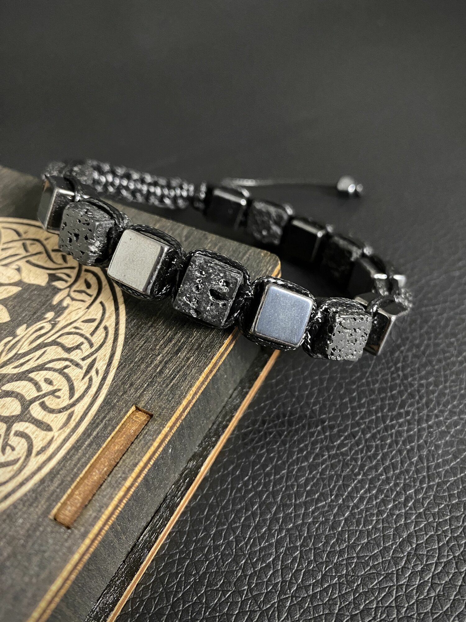 Браслет плетеный из натуральных камней гематит и лава куб, размер бусин 8 мм