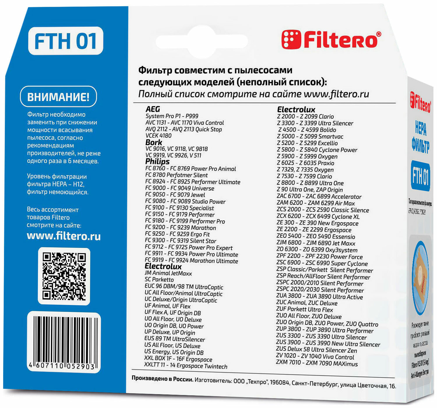 HEPA фильтр Filtero FTH 01 для пылесосов PHILIPS, ELECTROLUX, AEG, BORK