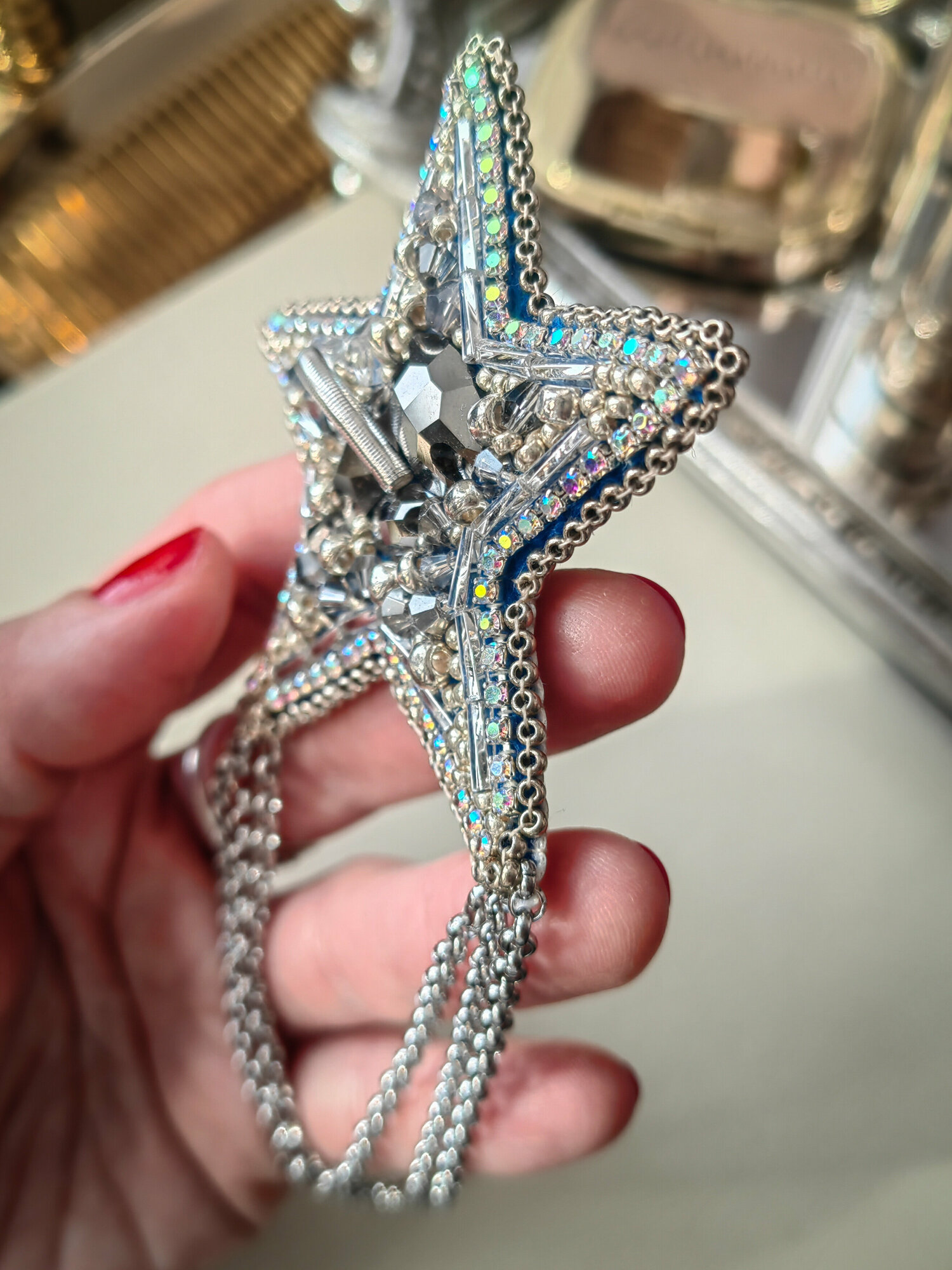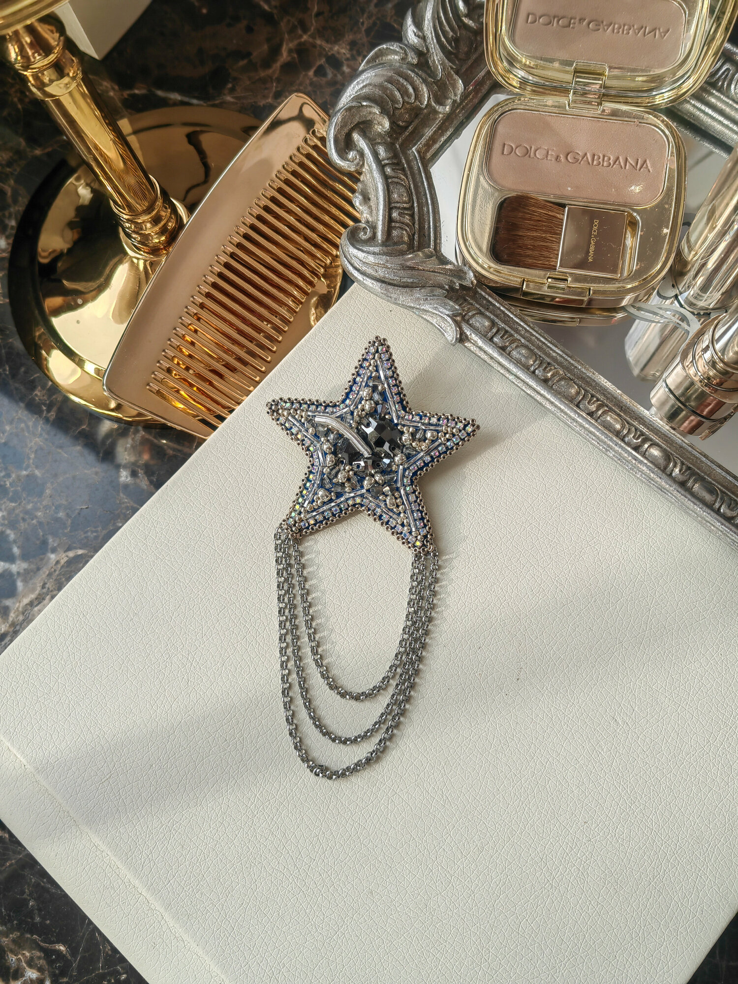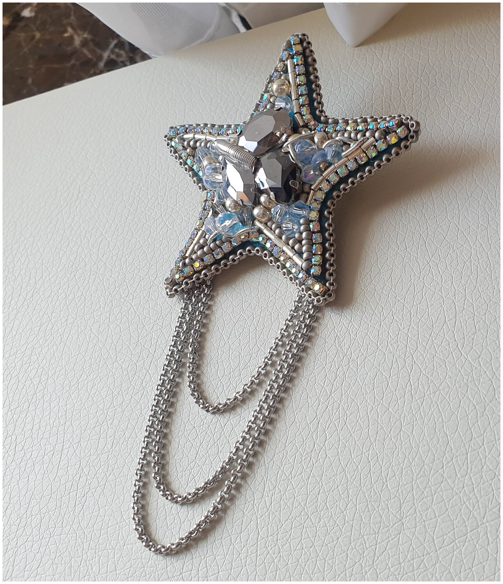 Брошь булавка Звезда из бисера. Брошка ручной работы с цепями. Украшение на пиджак, на пальто, на шарф. интересное: