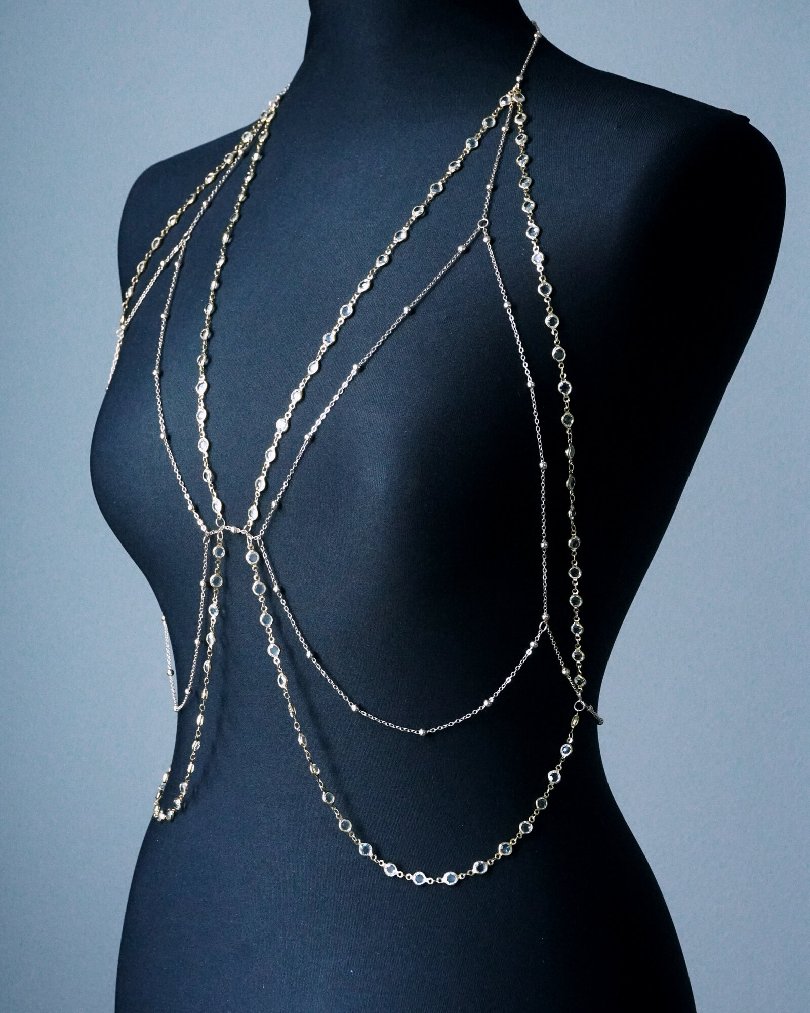 Бодичейн, золотая цепочка на плечи с черными стразами