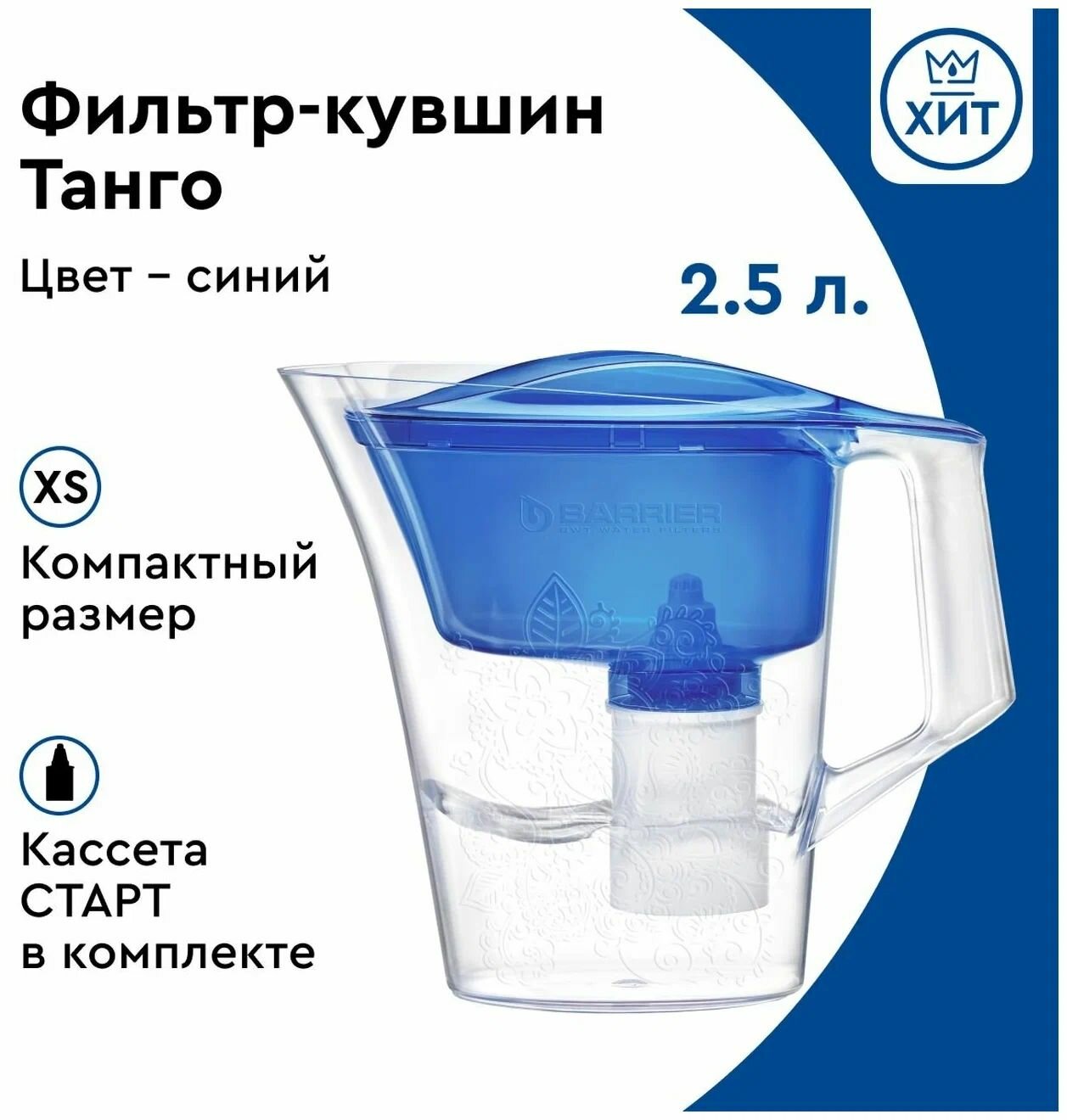 Кувшин-фильтр для воды Барьер Танго синий с узором, с картриджем, 2,5л, без индикатора ( Артикул 282967 )