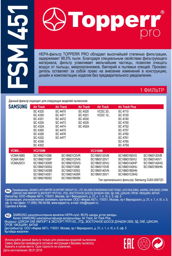 Topperr Hepa-фильтр для пылесосов SAMSUNG, 1 шт., FSM 451 интересное: