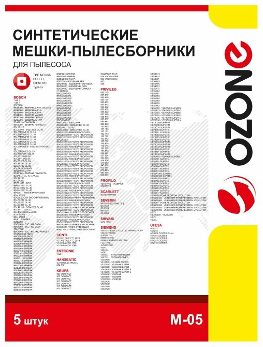 Синтетические мешки-пылесборники Ozone M-05 для пылесоса BOSCH, SIEMENS, SCARLETT, UFESA, PRIVILEG, KRUPS, 5 шт