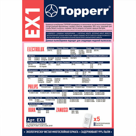 Topperr EX1 Пылесборник для пылесоса Electrolux,Philips,AEG (S-bag,Gr200) 5 шт.