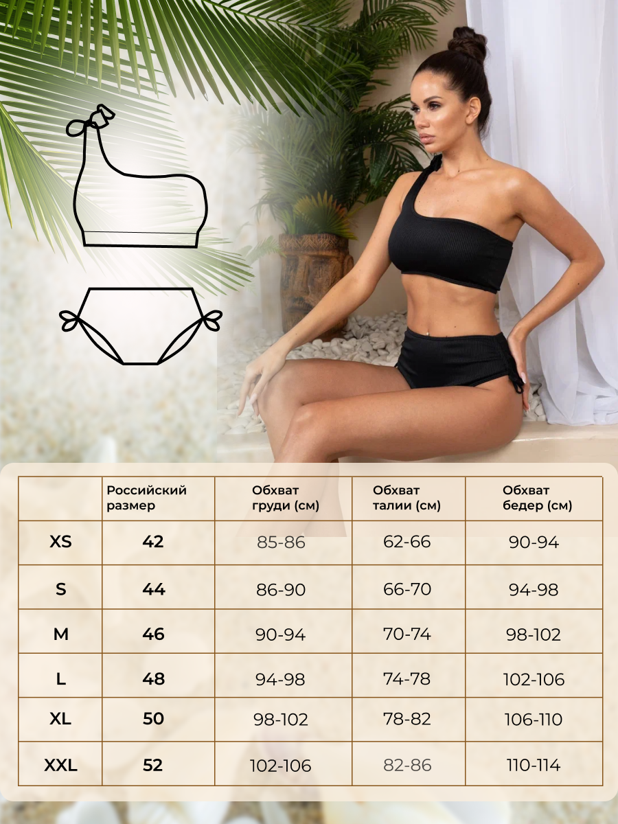 | Дополнительная информация | В комплект входит топ бандо и плавки бразильяна. Эластичный лиф на одно плечо (правое) с мягкими чашками не просвечивает, подчеркивает формы и при этом не сползает во время плавания, отдыха или спортивных игр на пляже. |