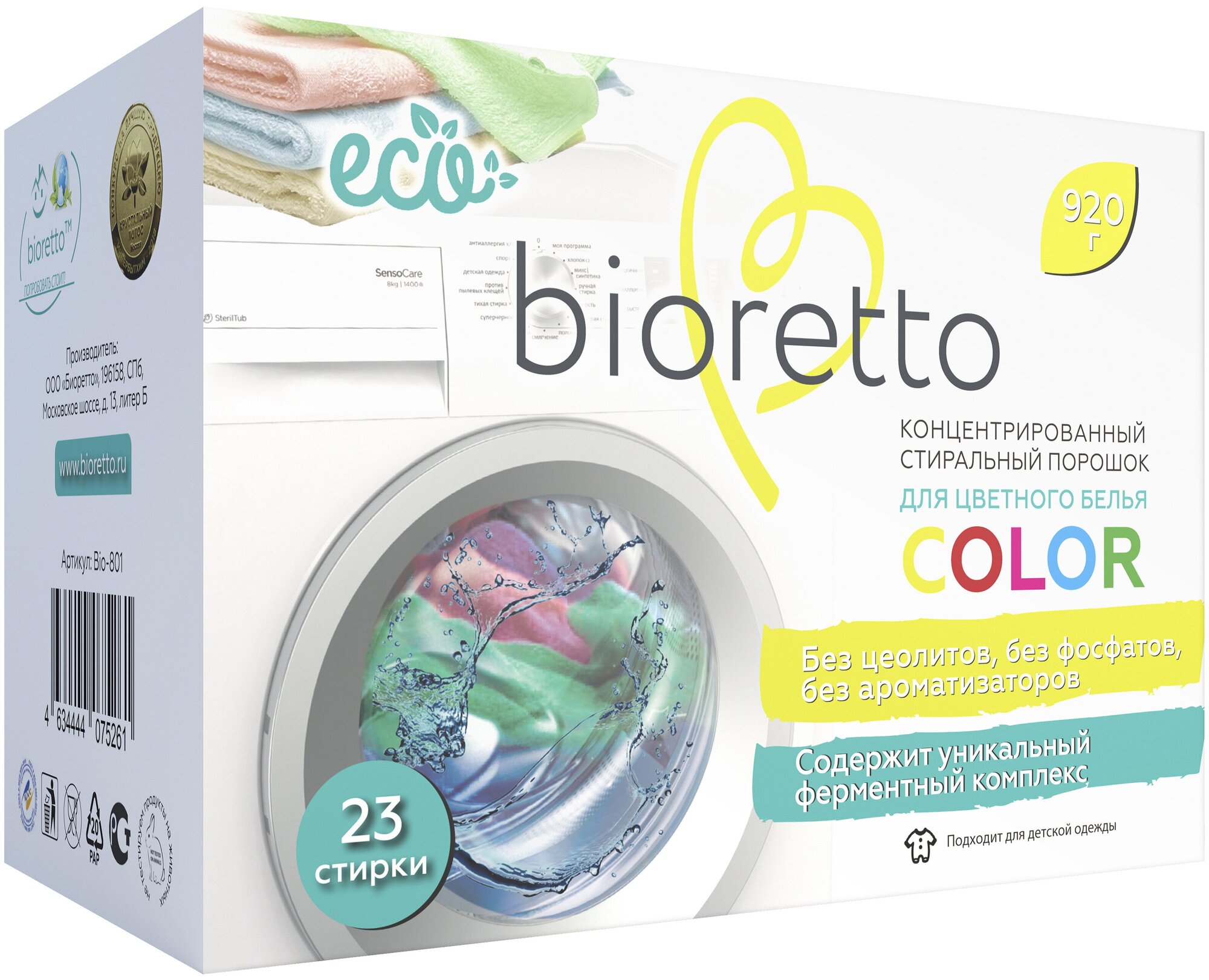 Купить Экологичный концентрированный стиральный порошок для цветного белья bioretto, "COLOR", 920 г