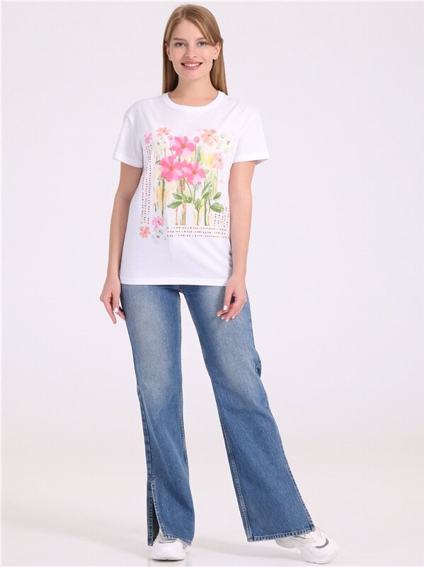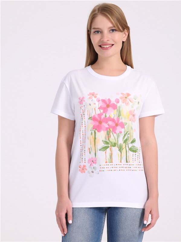 Футболка женская белая с принтом хлопок Апрель 1ЖДФК3298001/1190/31/*/3453/*/*/* белый,розовый,зеленый 104-164