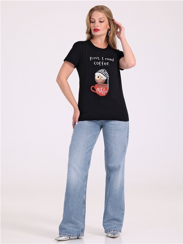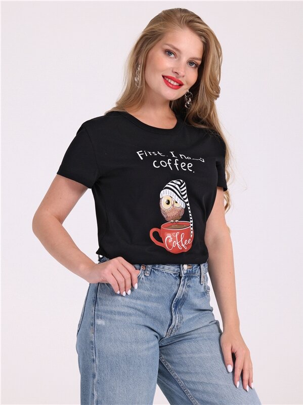 Футболка женская черная с принтом хлопок 100% Апрель 1ЖДФК2657001/1190/599/*/2537/*/*/* черный 84-164