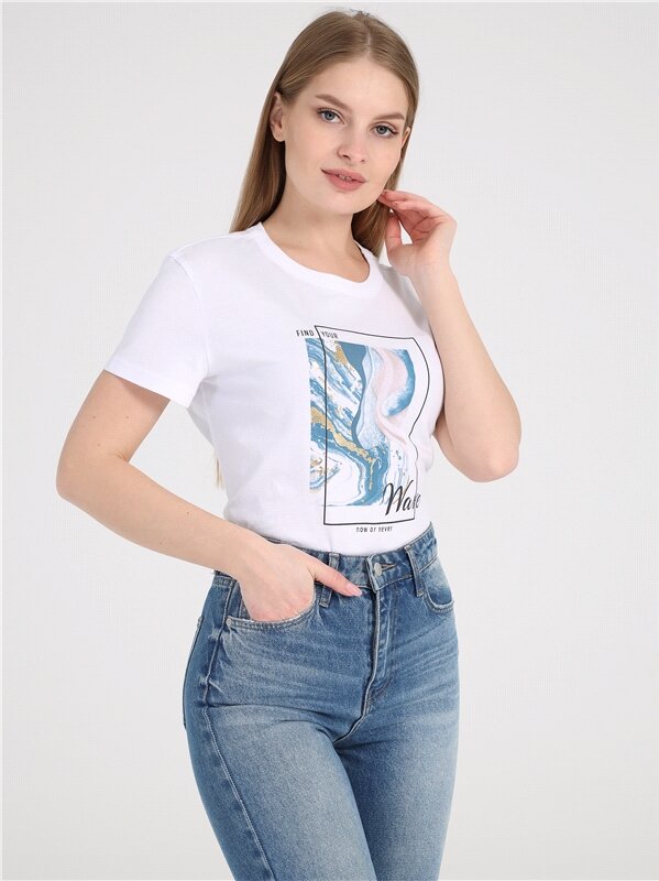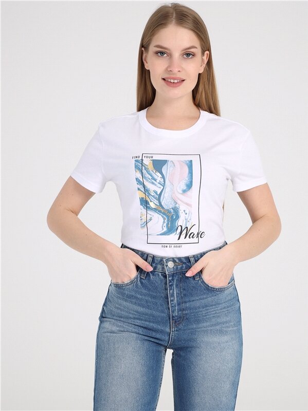 Купить Футболка женская белая с принтом хлопок 100% Апрель 1ЖДФК2657001/1190/31/*/3238/*/*/* белый,голубой 96-164