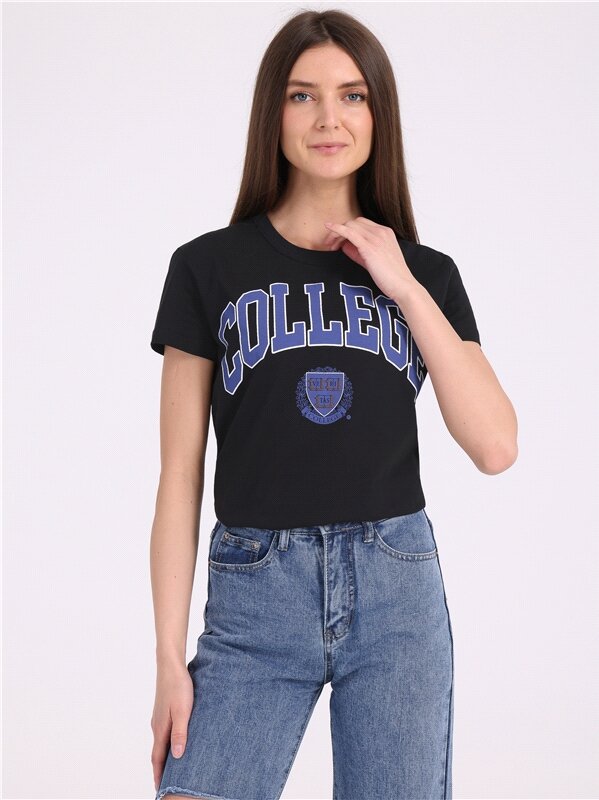 Купить Футболка женская черная с принтом хлопок 100% Апрель 1ЖДФК3350001/1190/599/*/3327/*/*/* черный,синий 96-164