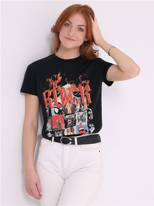 Футболка женская черная с принтом хлопок 100% Апрель 1ЖДФК3784001/1190/599/*/3229/*/*/* черный 96-164