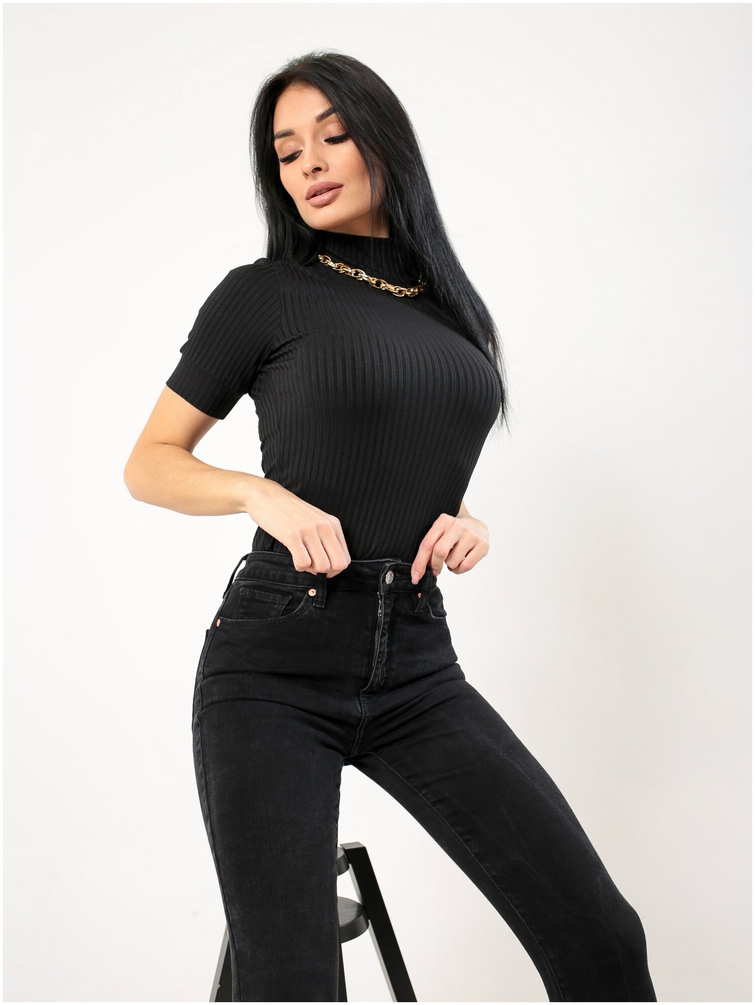 Женская водолазка лапша джемпер с коротким рукавом, повседневная, София37, цвет черный, размер 46