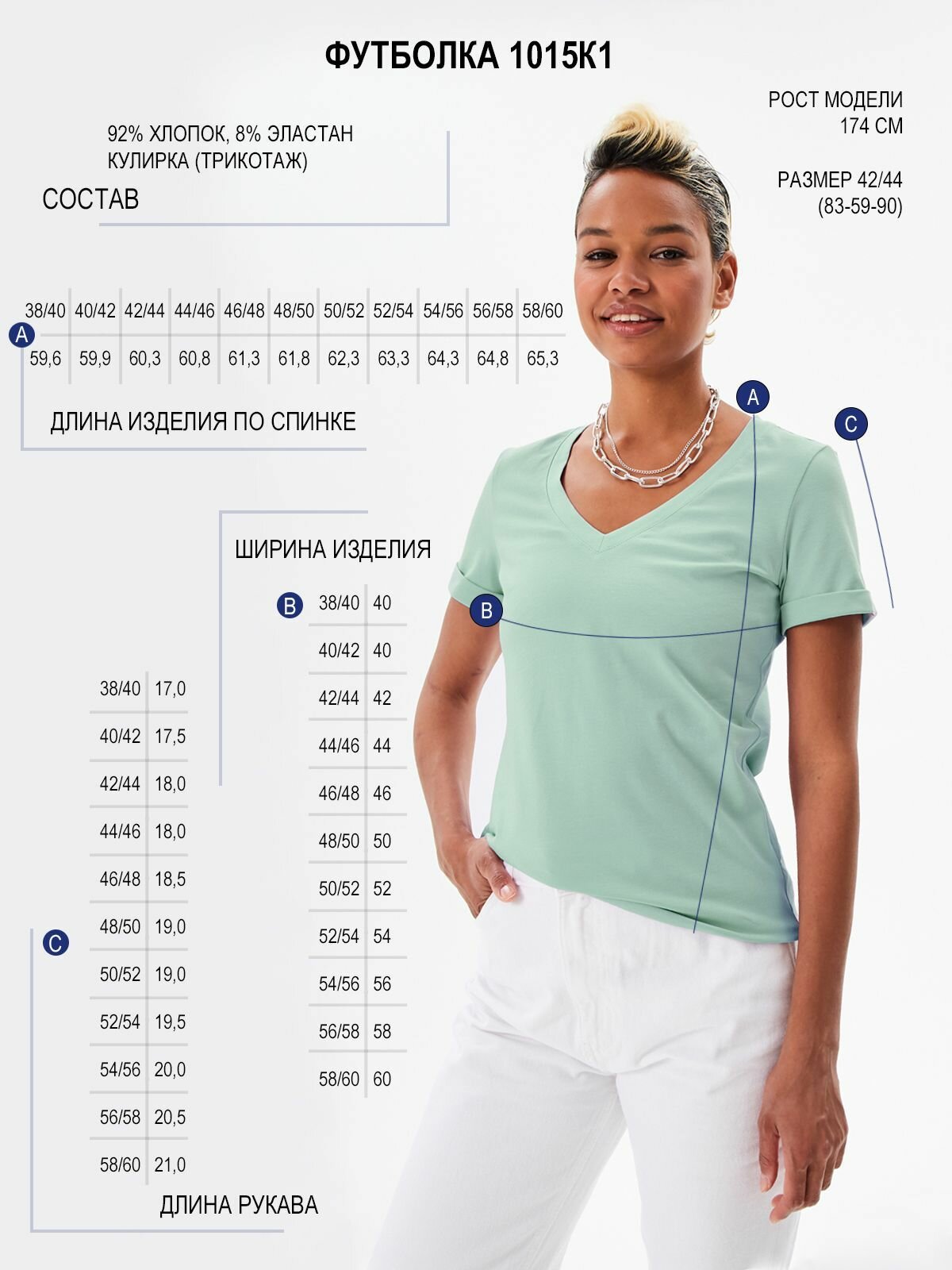 1015K1 Футболка с глубоким V-вырезом HIGH TEMP, Мятный, 44/46