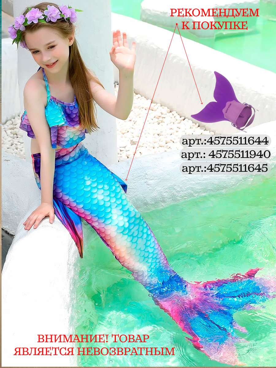 | Комплектация | хвост русалки, раздельный купальник, комплект украшений, ободок с цветами |