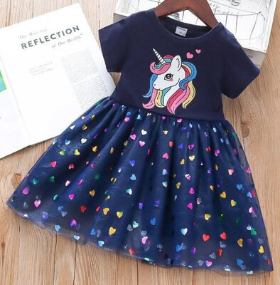 Платье для девочки Единорог - синий с сердечком - размер 120