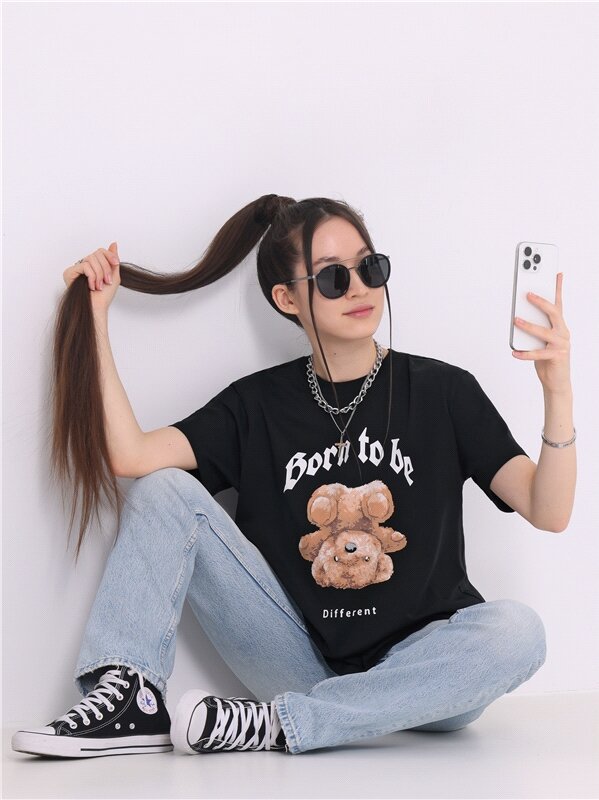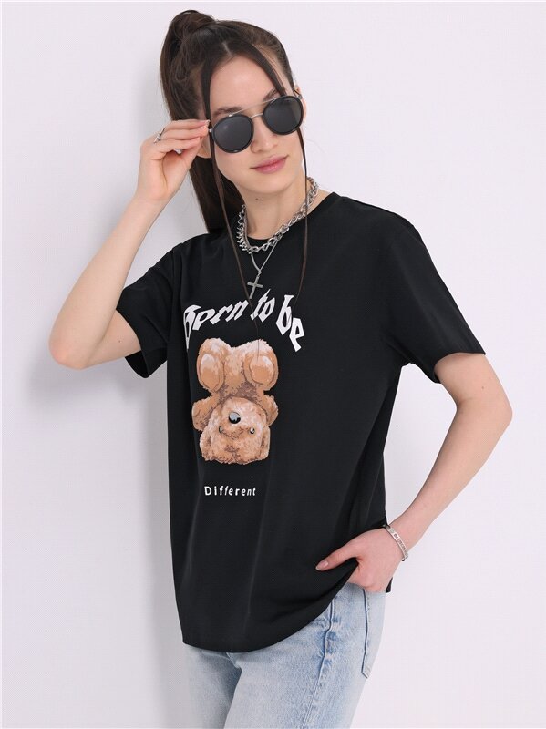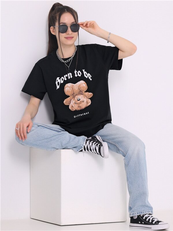 Купить Футболка женская черная оверсайз с принтом хлопок 100% Апрель 1ЖДФК4217006/1420/599/*/3394/*/*/* черный,коричневый 92-164
