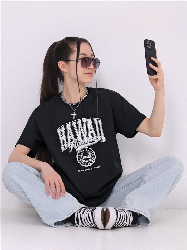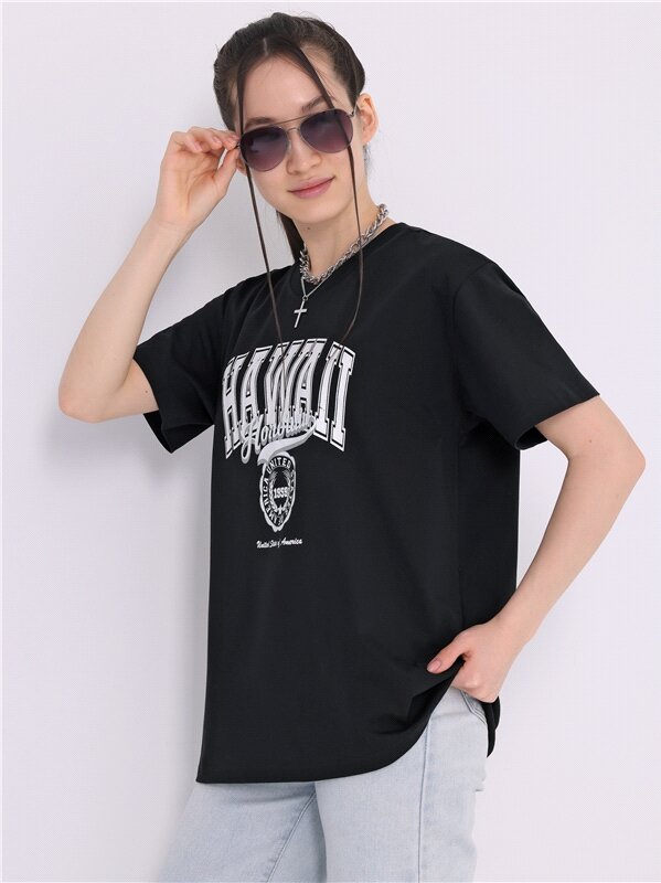 Футболка женская черная оверсайз с принтом хлопок 100% Апрель 1ЖДФК4217006/1420/599/*/3394/*/*/* черный,коричневый 92-164