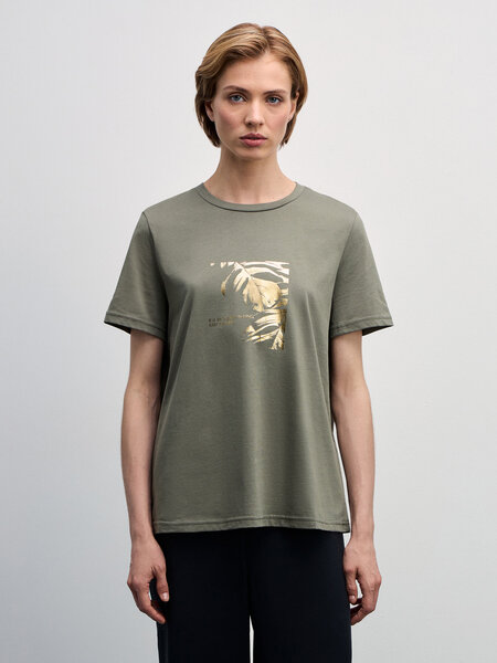 Купить Zarina Базовая футболка из хлопка с принтом, цвет Хаки/оливковый, размер S (RU 44), 4327510410-13