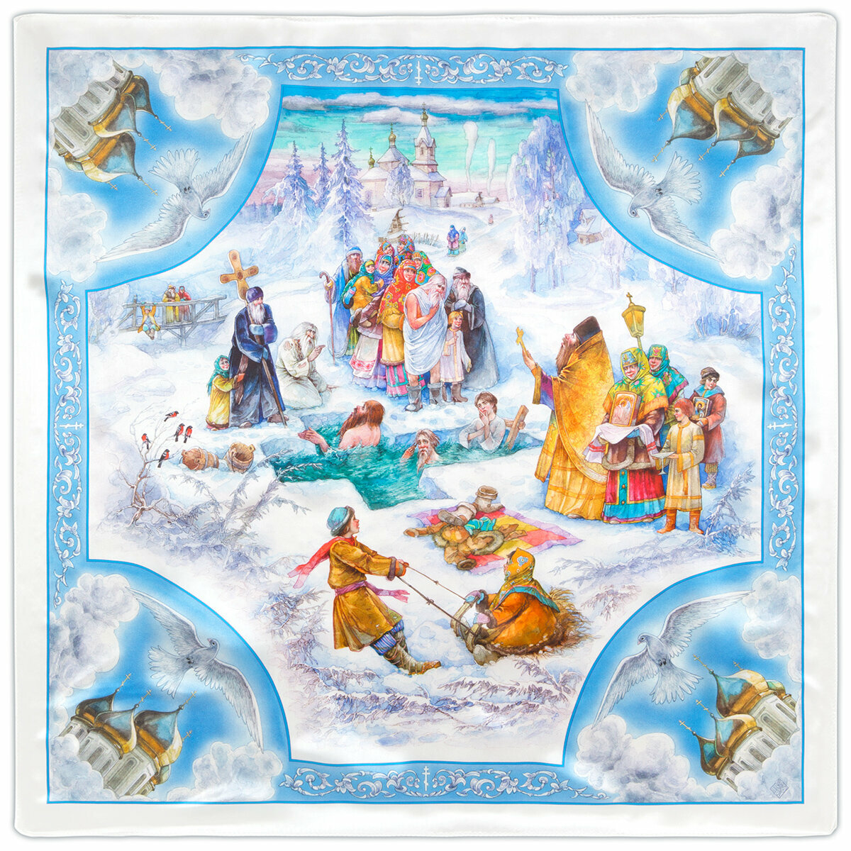 Платок на голову женский шелковый Павловопосадские платки 10998 "Праздник крещения" вид 0, голубой 89х89 см интересное: