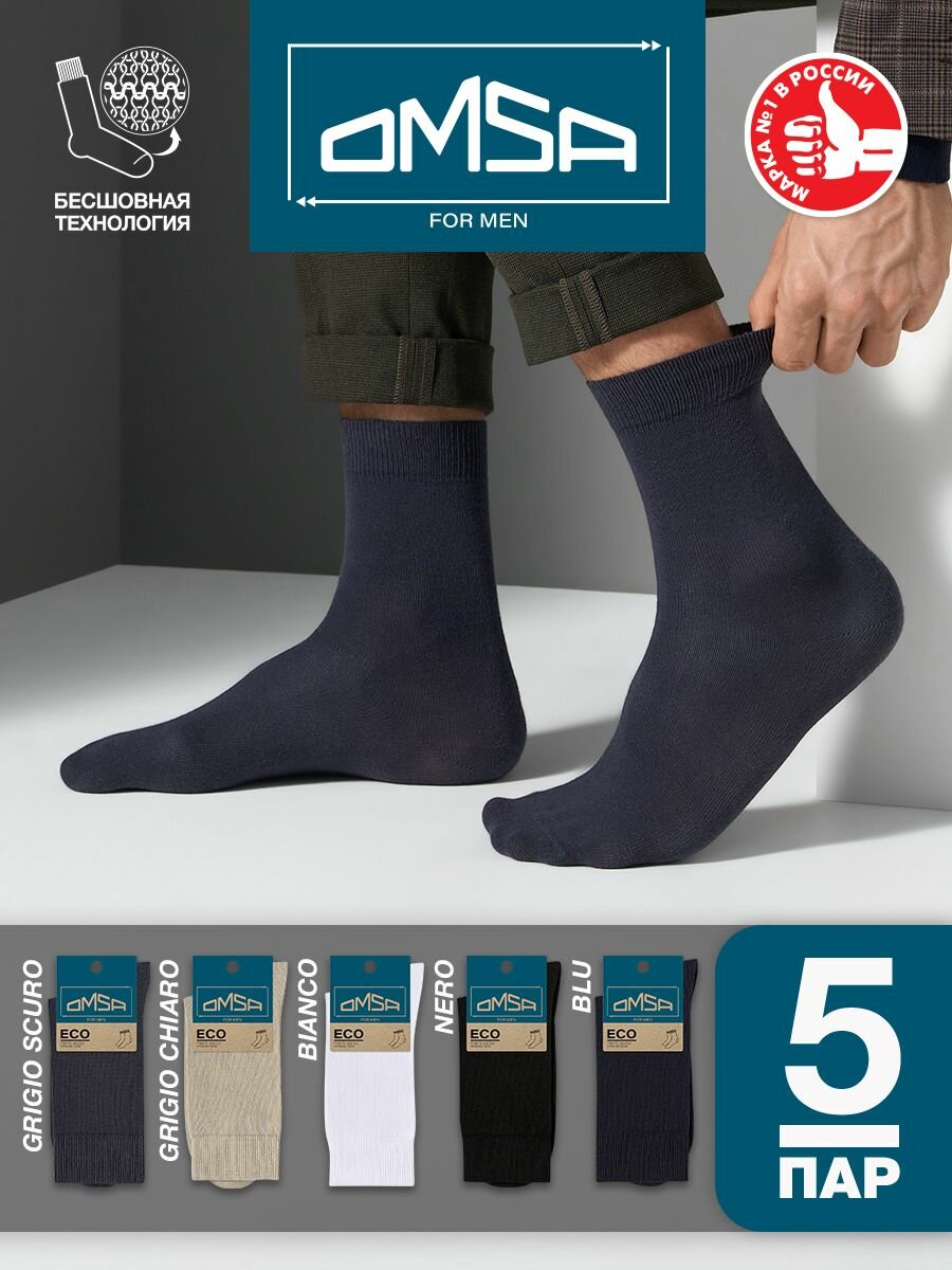 Купить Носки мужские OMSA ECO 401, высокие, комплект 5 пар, Цвет Nero/Grigio Scuro/Grigio Chiaro/Blu/Bianco, Размер 42-44 (27-29)