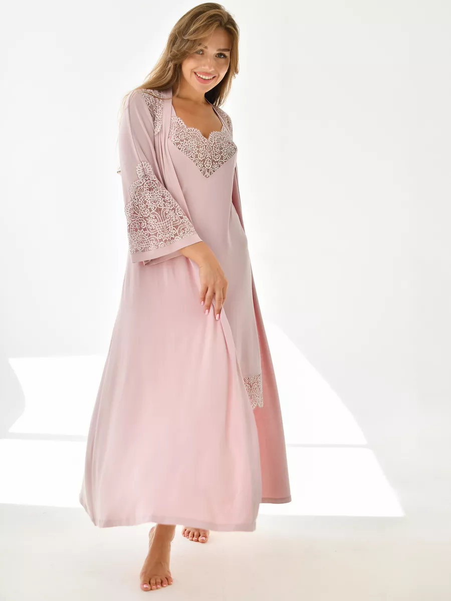 Пеньюар Маркиза длинный халат и укороченная сорочка с эластичным кружевом на широкой бретели. Премиум -качества. Цвет розовый. Размер 46