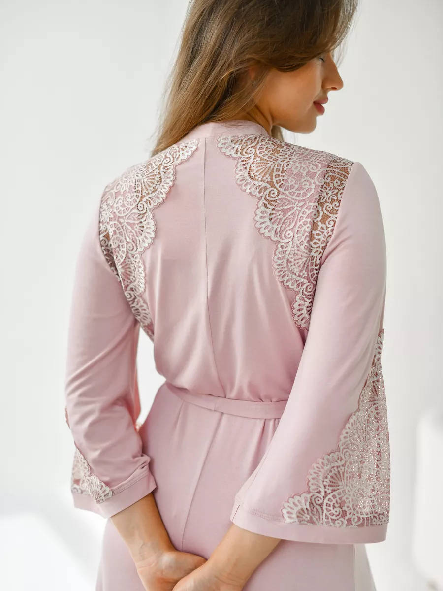 Пеньюар Маркиза длинный халат и укороченная сорочка с эластичным кружевом на широкой бретели. Премиум -качества. Цвет розовый. Размер 46