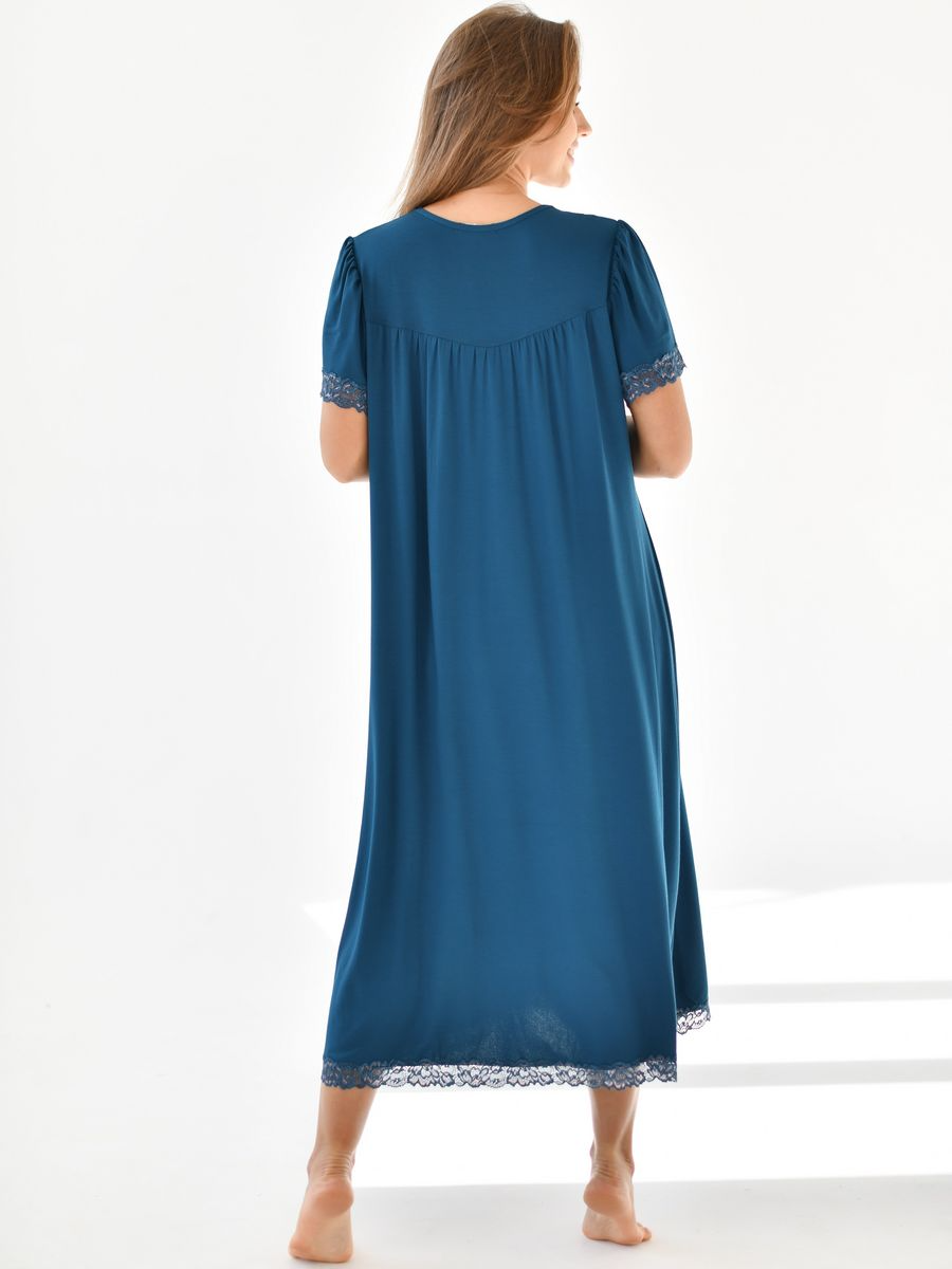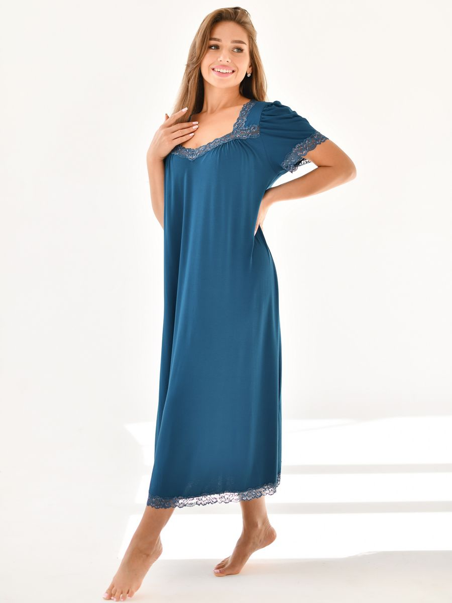 Женская ночная сорочка вискоза, длинная ночная рубашка с рукавом вискозная, размер 48, цвет бирюзовый, с кружевом. Текстильный край.