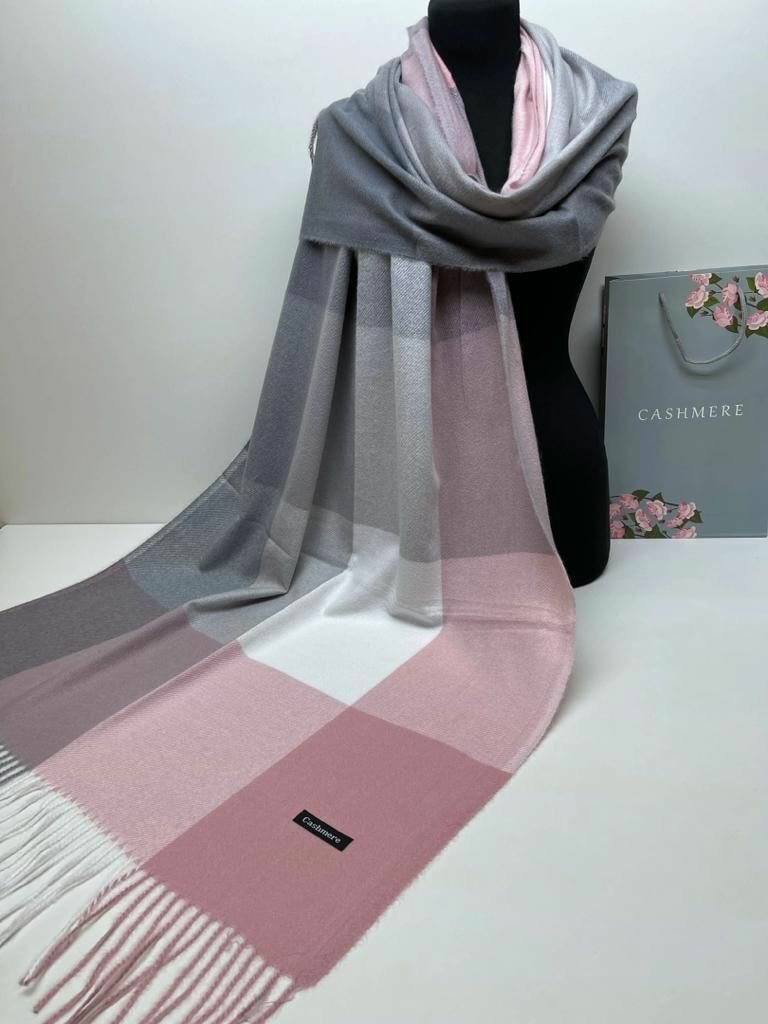 Палантин Cashmere, кашемир, с бахромой, 180х70 см, серый, розовый интересное: