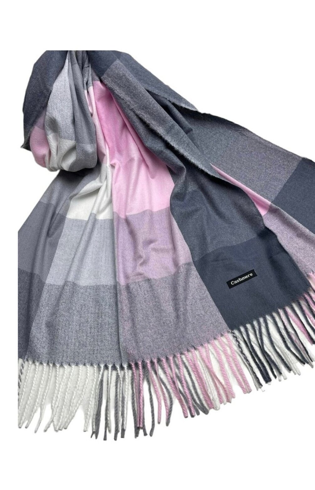 Палантин Cashmere, кашемир, с бахромой, 180х70 см, серый, розовый